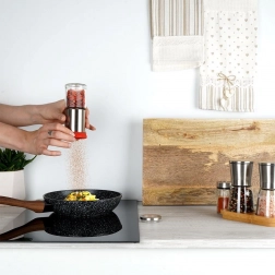 Eleganckie metalowe korpus dobrze leży w dłoni, element antypoślizgowy zapewnia pewny chwyt i łatwe mielenie także jedną ręką. Praktyczna nasadka chroni zawartość przed powietrzem i wilgocią, dzięki czemu przyprawy pozostają dłużej świeże i aromatyczne.