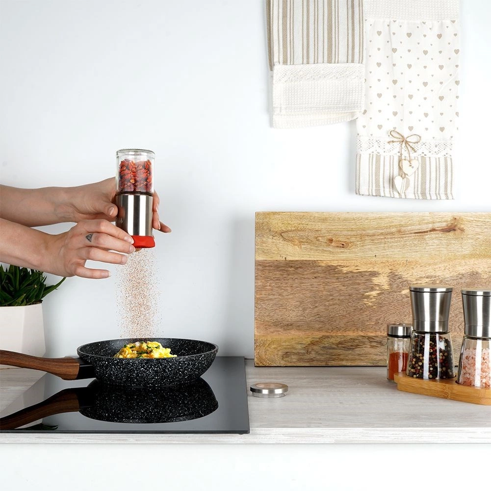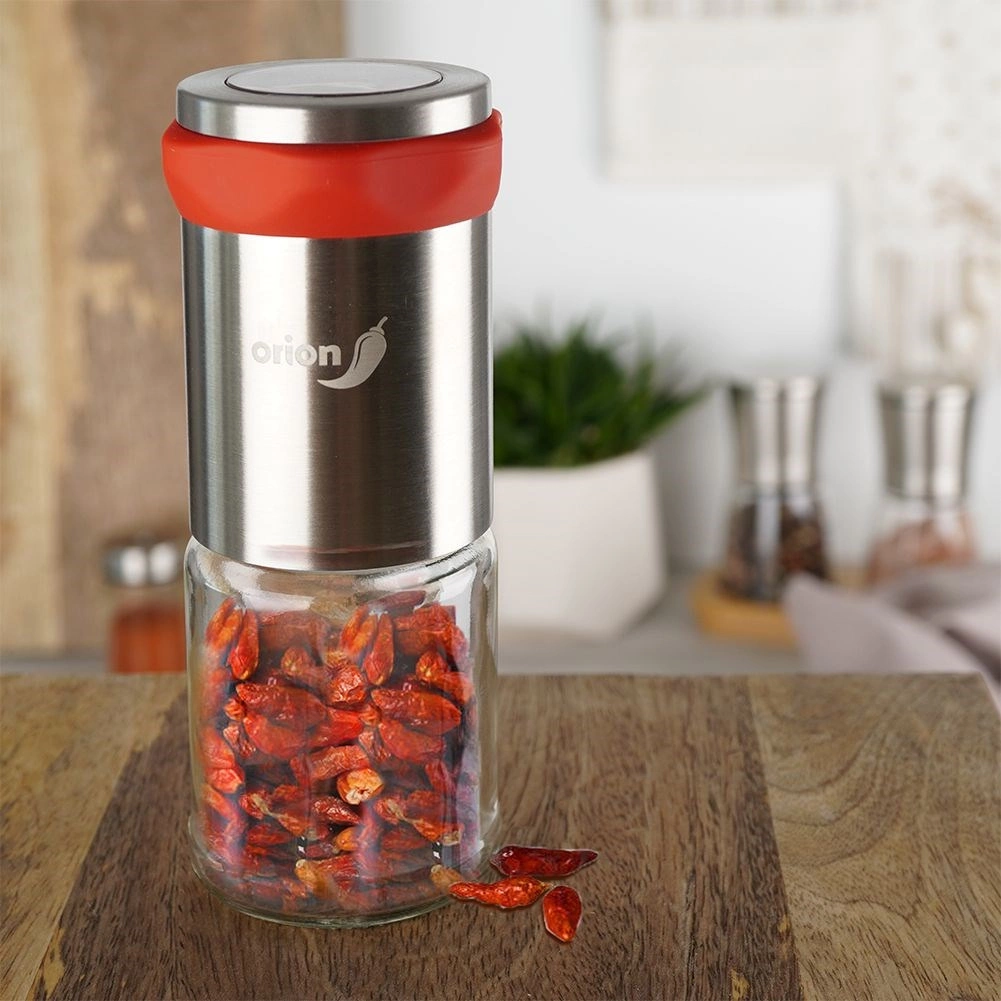 Stylowy ręczny młynek do chilli, pieprzu i ziół do świeżo mielonych przypraw bezpośrednio przed podaniem. Łączy szklany pojemnik z trwałym mechanizmem ze stali nierdzewnej, który delikatnie i skutecznie tnie suszone papryczki bez miażdżenia. Ergonomiczny kształt z antypoślizgowym uchwytem wygodnie leży w dłoni, a elegancki design zdobi każdą kuchnię. W zestawie ochronna nasadka przeciw wilgoci dla dłuższej świeżości.