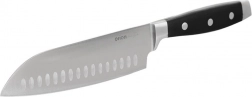 Nóż santoku z kolekcji Master to niezawodny pomocnik w każdej kuchni – od domowej po gastronomiczną. Dzięki wysokiej jakości stali nierdzewnej i wybrusom granton żywność mniej przywiera do ostrza, a krojenie mięsa, warzyw czy ryb jest płynne i precyzyjne. Ergonomicznie ukształtowana rękojeść z ABS z 3 nitami świetnie leży w dłoni i nie ślizga się.