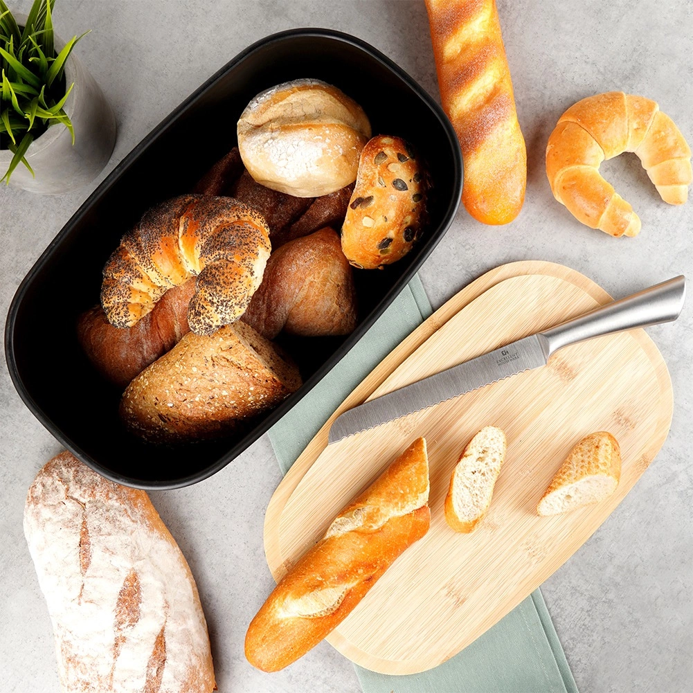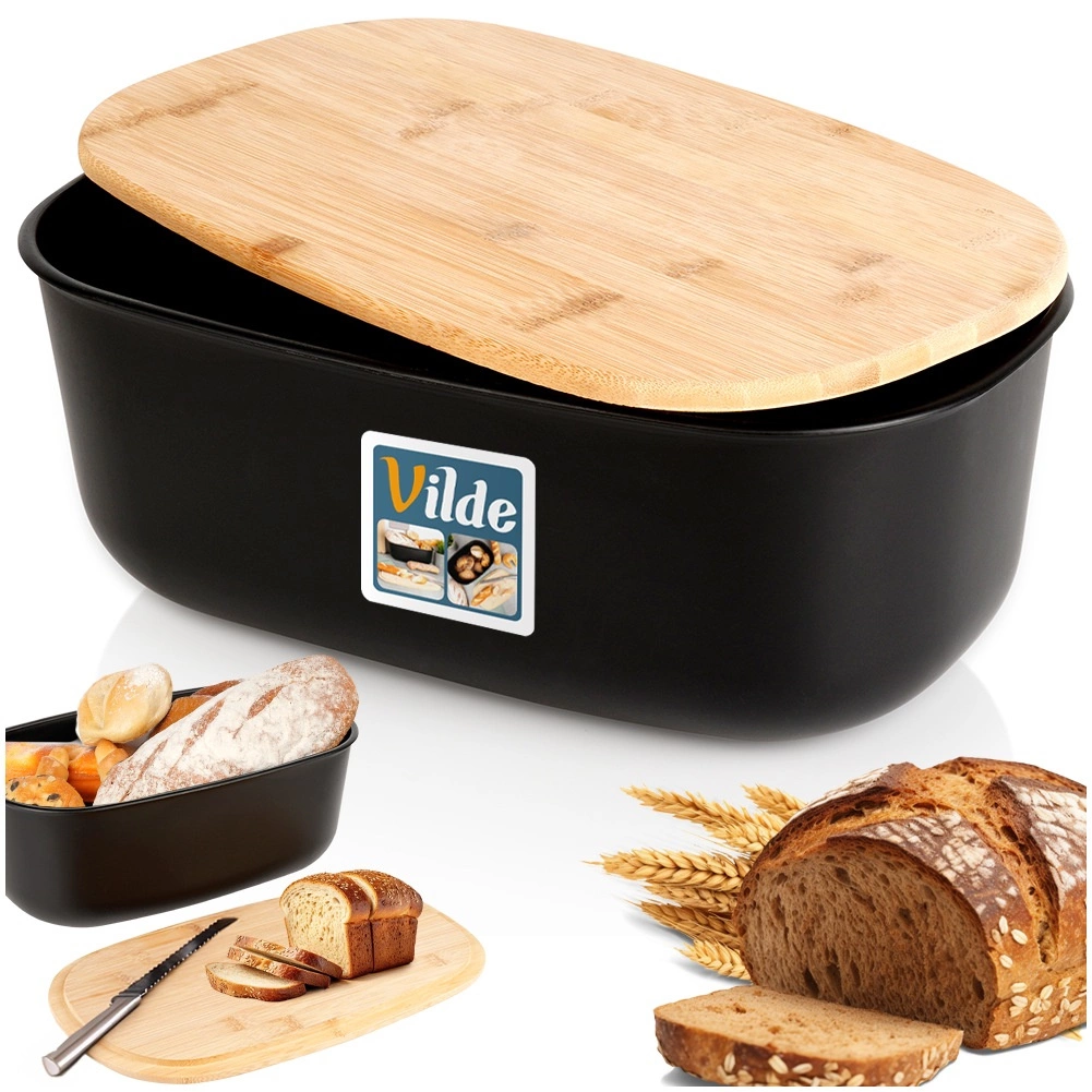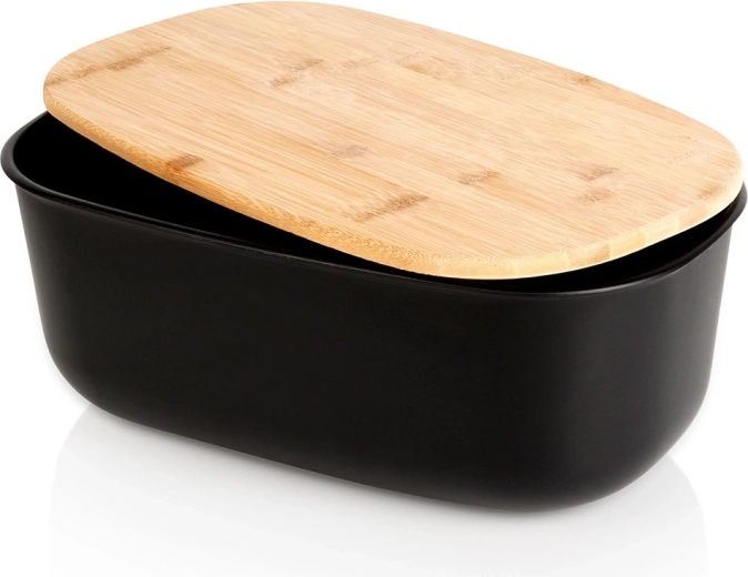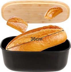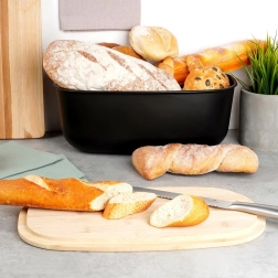 Pojemny chlebak o wymiarach 39 × 23,5 × 15,5 cm zapewnia dużo miejsca na chleb, kajzerki, bułki i słodkie wypieki. Owalny kształt i matowe czarne wykończenie doskonale pasują do nowoczesnej i klasycznej kuchni, a bambusowa pokrywka dodaje naturalnego akcentu.