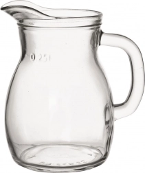 Praktyczny szklany dzbanek o całkowitej pojemności 300 ml ze znacznikiem 0,25 l do precyzyjnego dozowania. Z wytrzymałego, przezroczystego szkła, z wygodnym uchem i profilowanym dzióbkiem zapewniającym czyste nalewanie. Odpowiedni na mleko, śmietankę, wino, wodę, sok oraz sosy, do zmywarki i kuchenki mikrofalowej. Maksymalna temperatura napoju 60 °C.