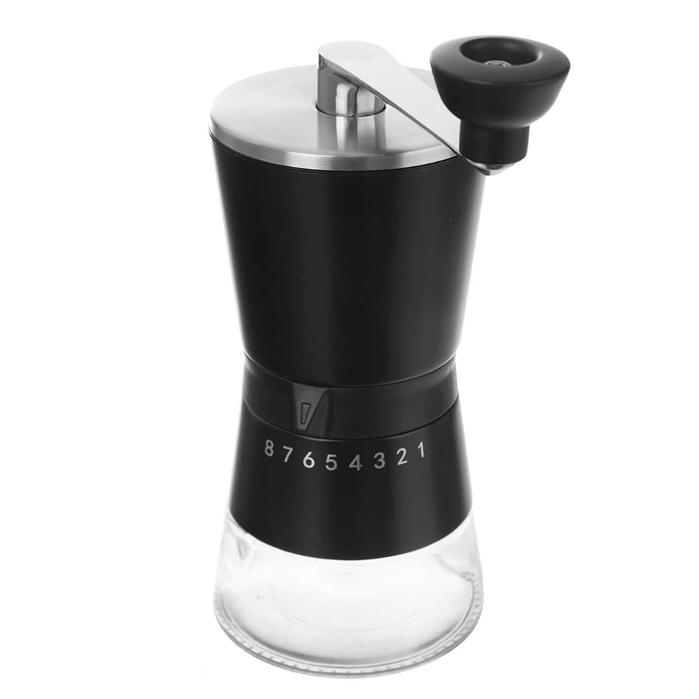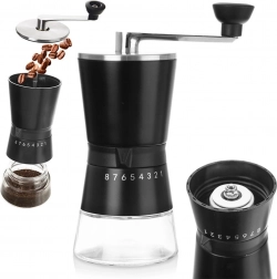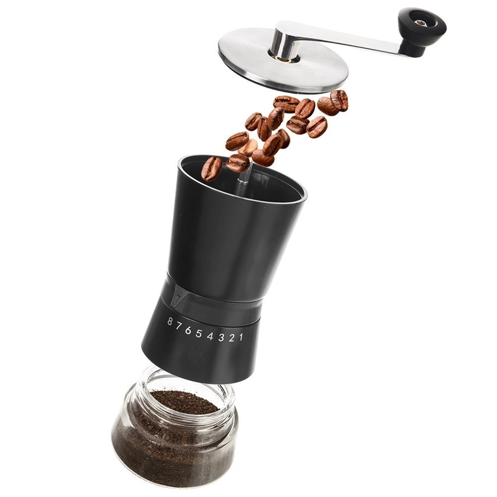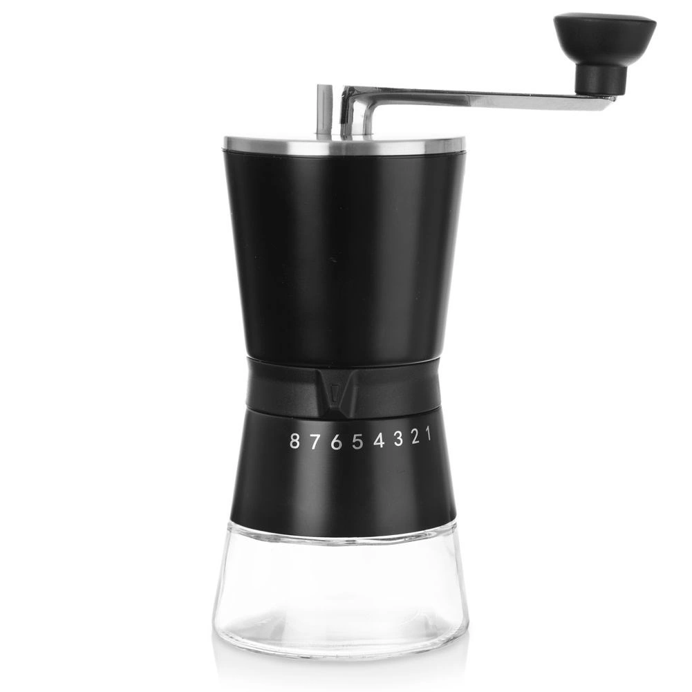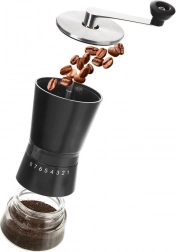 Korpus z nierdzewnej stali z matową, antypoślizgową powłoką jest wytrzymały i wygodnie leży w dłoni. Dolny przezroczysty szklany pojemnik pozwala kontrolować ilość zmielonej kawy. Metalowa korbka z wygodnym uchwytem zapewnia równomierne mielenie bez wysiłku.
