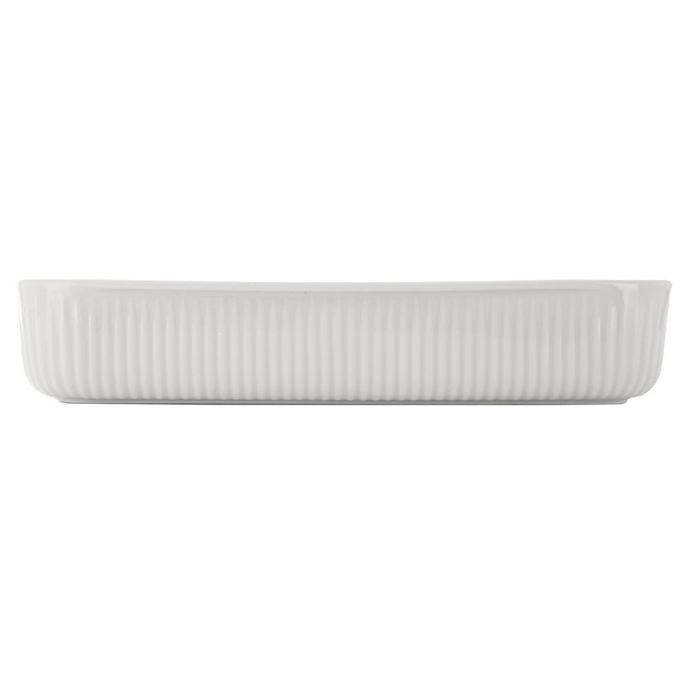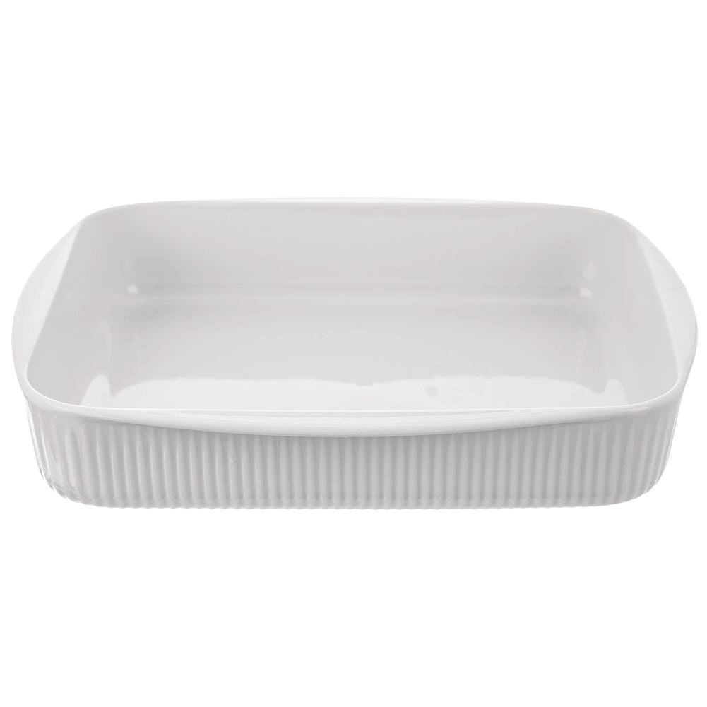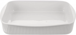 Praktyczne białe porcelanowe naczynie do zapiekania o pojemności 2,2 l i wymiarach 30,5 × 24,5 × 5,5 cm do codziennego pieczenia i serwowania. Wykonane z wysokiej jakości porcelany z tradycyjnej wytwórni w kraju karlowarskim, odpowiednie do piekarnika, kuchenki mikrofalowej, lodówki oraz zmywarki. Żebrowana powierzchnia zewnętrzna, gładkie wewnętrzne szkliwienie ułatwiające wyjmowanie i czyszczenie oraz zintegrowane boczne uchwyty dla wygodnego przenoszenia.