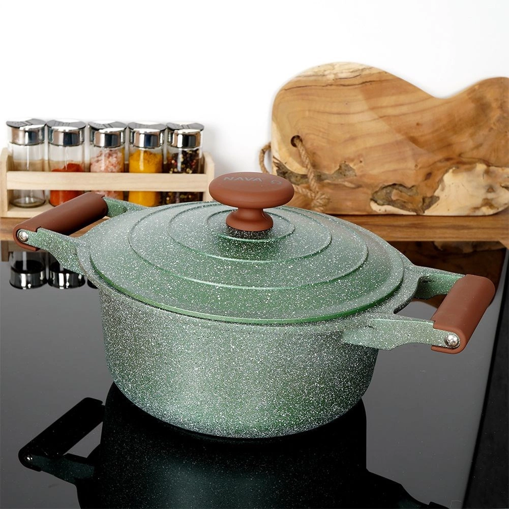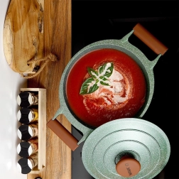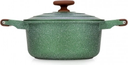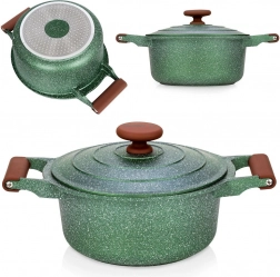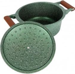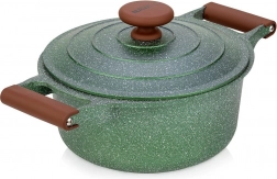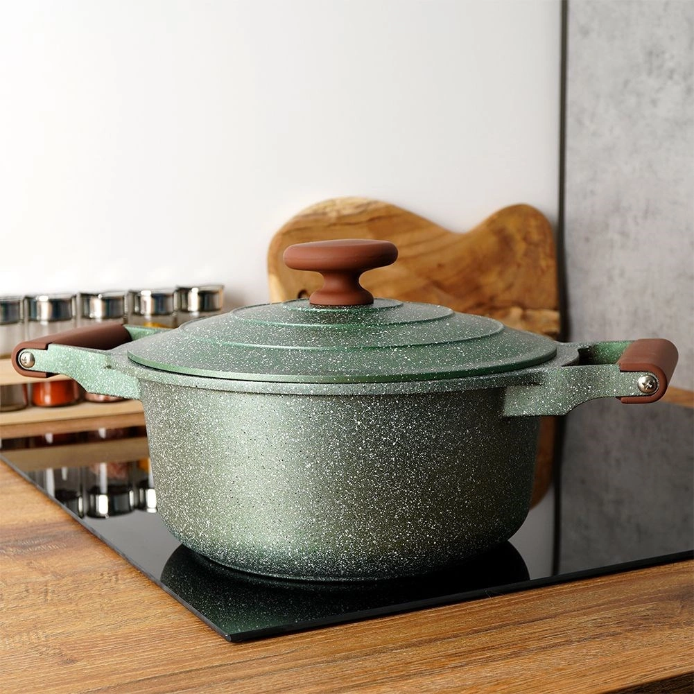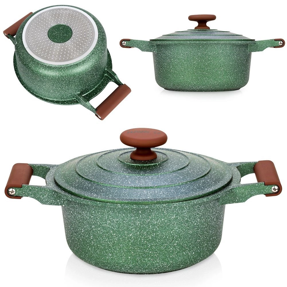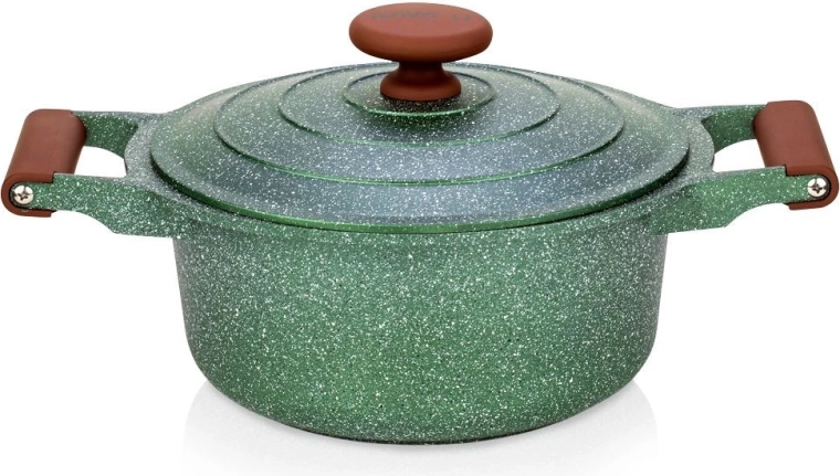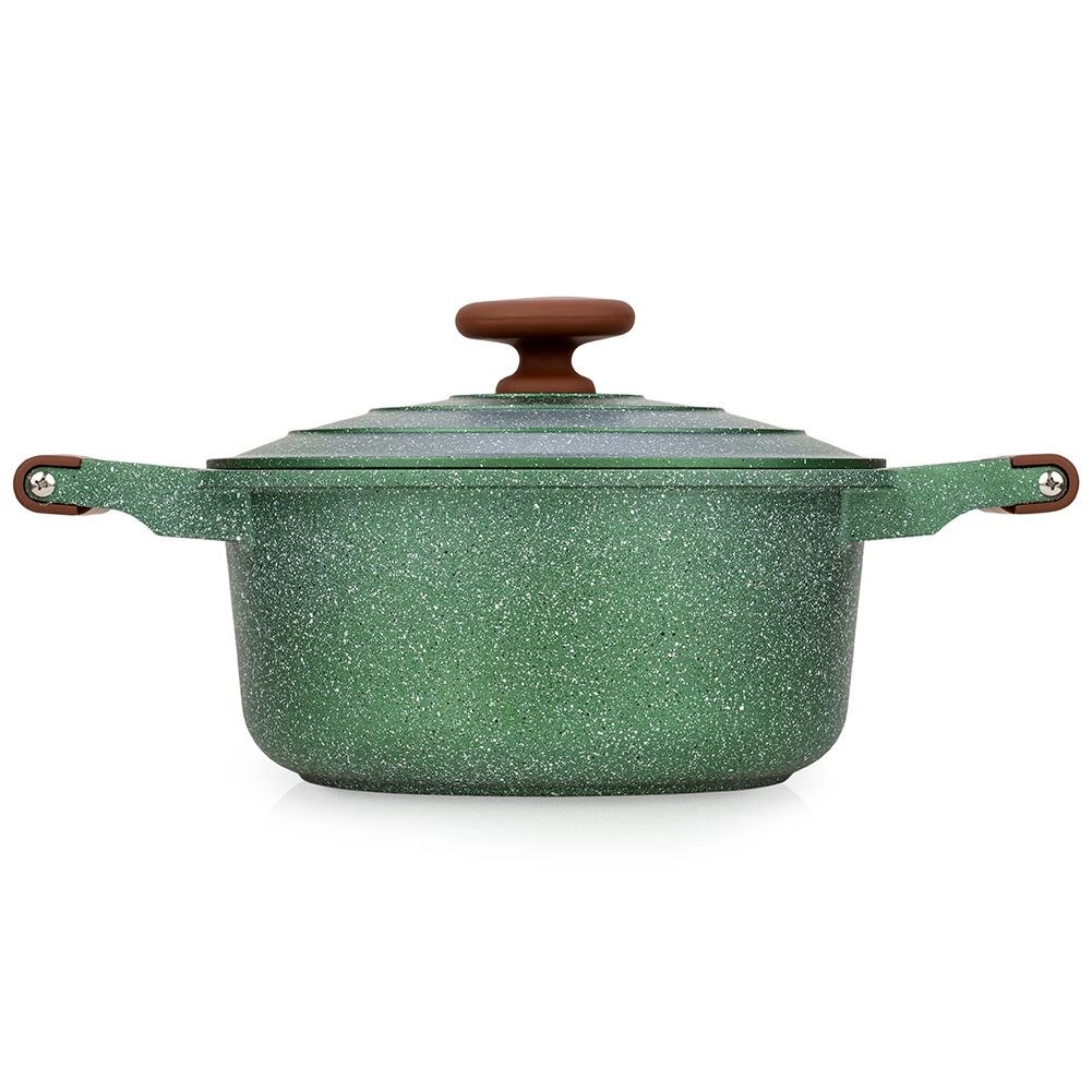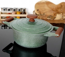 Odkryj praktyczność i elegancję w jednym. Ten ciemnozielony granitowy garnek z brązowymi uchwytami soft touch zachwyca ponadczasowym wyglądem i doskonałą wydajnością. Pięciowarstwowa powłoka granitowa gwarantuje nieprzywieranie, odporność na wysokie temperatury oraz łatwe czyszczenie, dzięki czemu gotowanie jest szybkie, zdrowe i bez zbędnego tłuszczu.