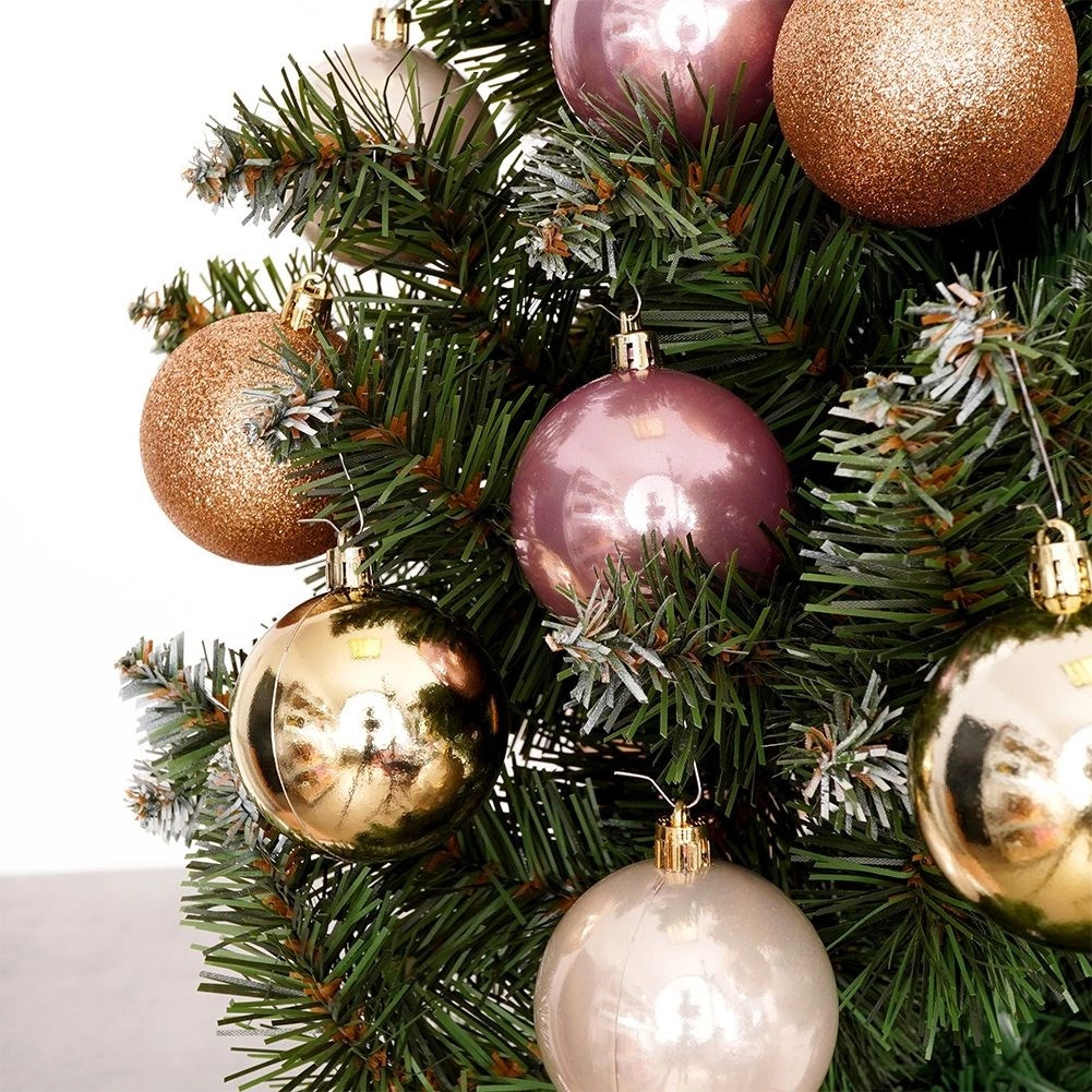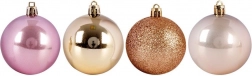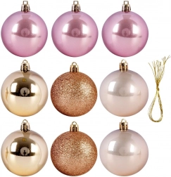 Elegancki zestaw dziewięciu bombek w odcieniach różu, perły i złota doda Twoim dekoracjom luksusowego blasku i harmonijnego wyglądu. Bombki o średnicy 6 cm wykonane są z nietłukącego plastiku, dzięki czemu są bezpieczne dla dzieci i zwierząt domowych. Mieszanka błyszczących, matowych i brokatowych wykończeń tworzy efektowne refleksy, a łatwe zawieszanie zapewniają dołączone złote sznureczki.