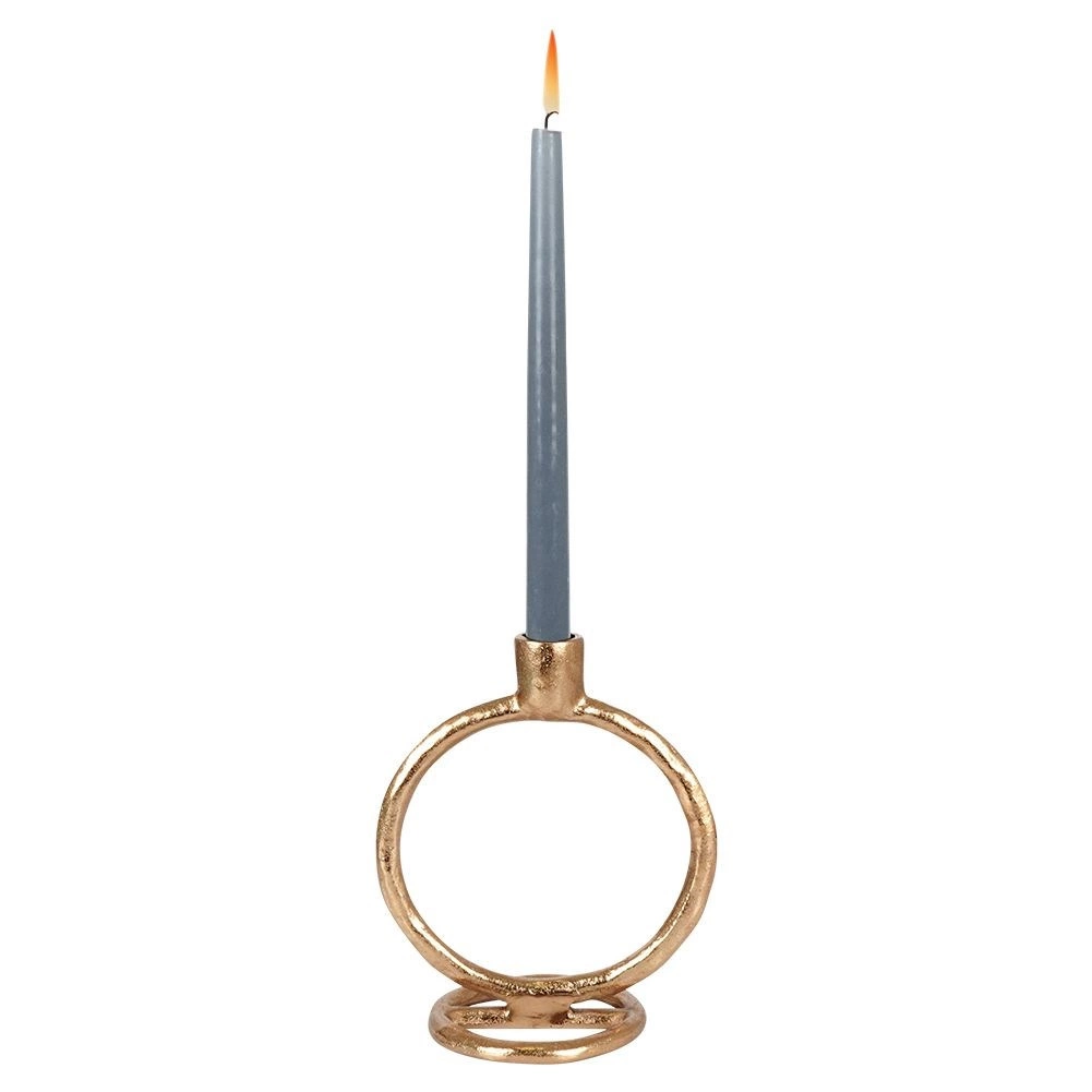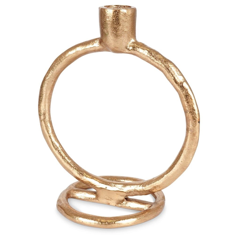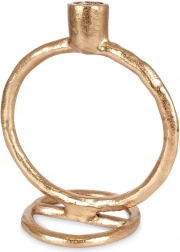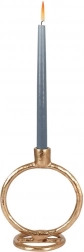 Elegancki świecznik na jedną długą świecę wykonany jest z wysokiej jakości aluminium w złotym kolorze. Dzięki solidnemu wykonaniu i stabilnej okrągłej podstawie bezpiecznie utrzyma świecę i jednocześnie stanie się wyrazistym elementem dekoracyjnym Twojego domu.