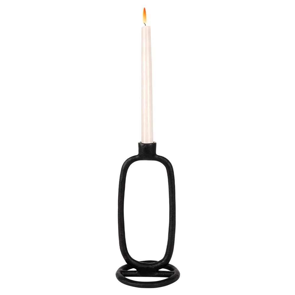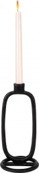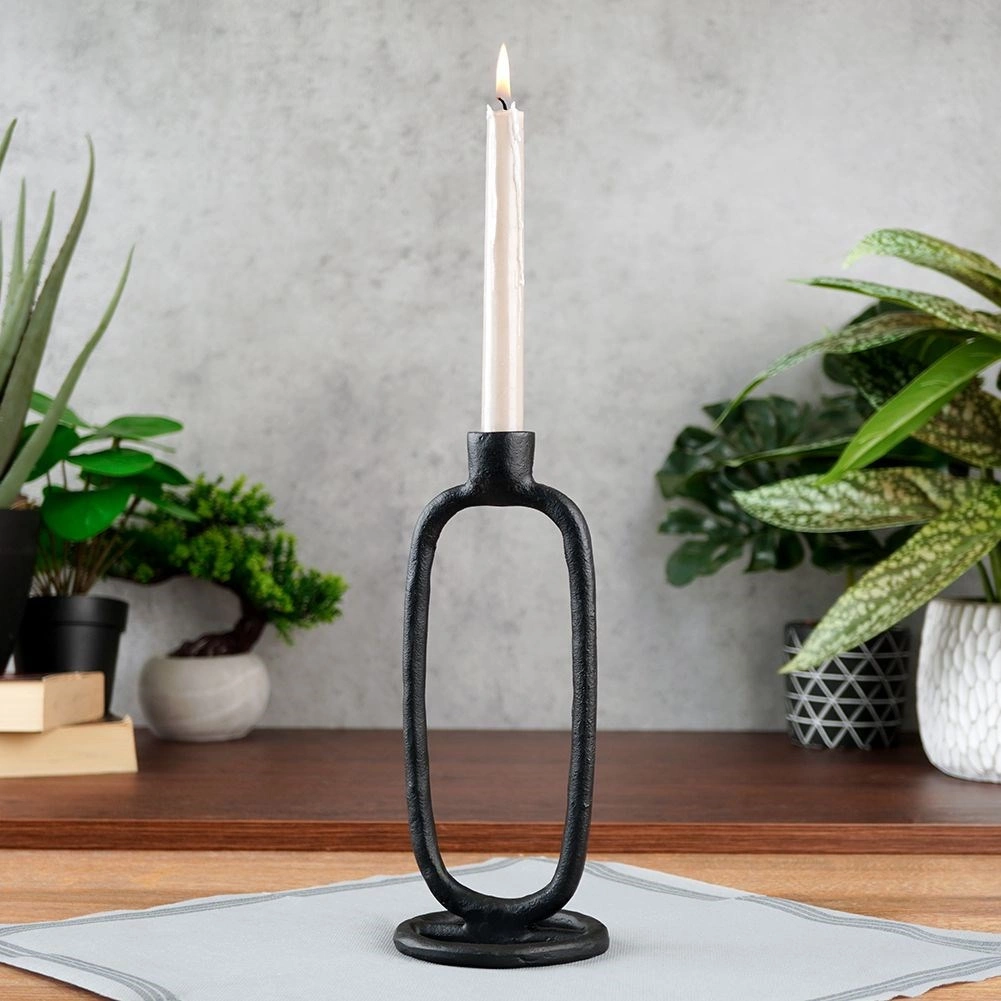 Stonowany, a zarazem wyrazisty dodatek do każdego domu. Świecznik w czarnym wykończeniu jest przeznaczony na długie świece o średnicy do 2 cm i dzięki solidnej aluminiowej konstrukcji stoi pewnie i bezpiecznie. Minimalistyczna owalna sylwetka łatwo łączy się z innymi dekoracjami i podkreśla charakter wnętrza.