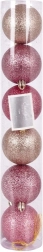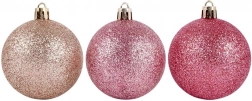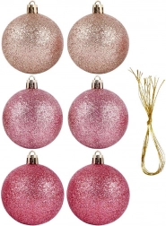 Elegancki zestaw sześciu różowych bombek choinkowych o średnicy 6 cm w połyskującym wykończeniu. Bombki wykonane są z wysokiej jakości plastiku, dzięki czemu są nie do odróżnienia od szkła, a jednocześnie bezpieczne i nierozbijalne. Trzy odcienie różu dodają choince stylowego, świątecznego blasku, a w komplecie znajdują się także złote sznureczki do zawieszenia.