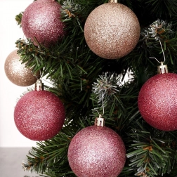 Zestaw łączy trzy różowe tony w brokatowym wykończeniu, które nadają choince głębi i eleganckiego uroku.