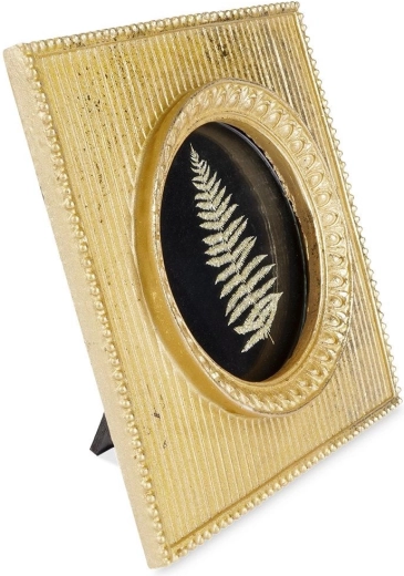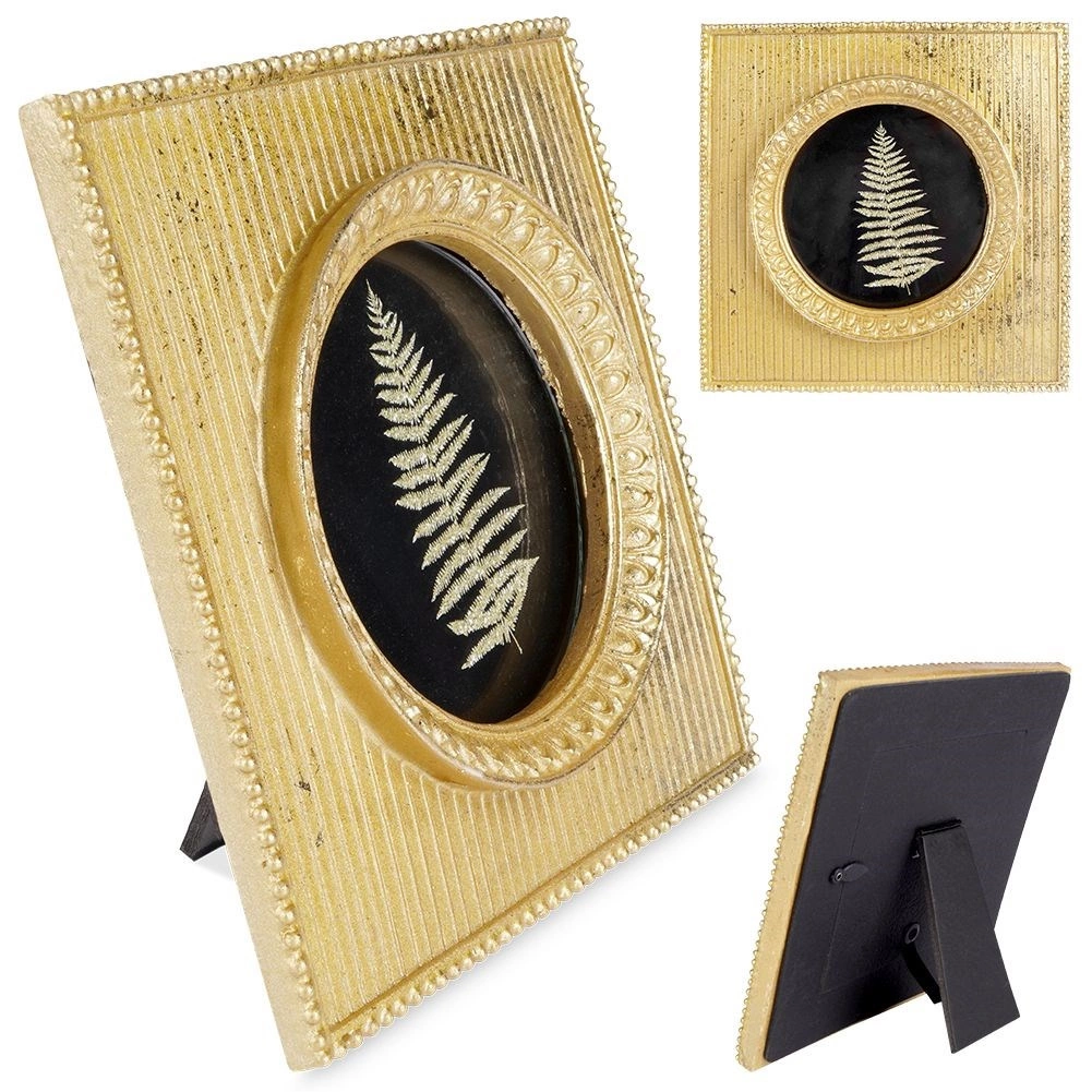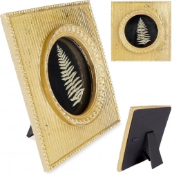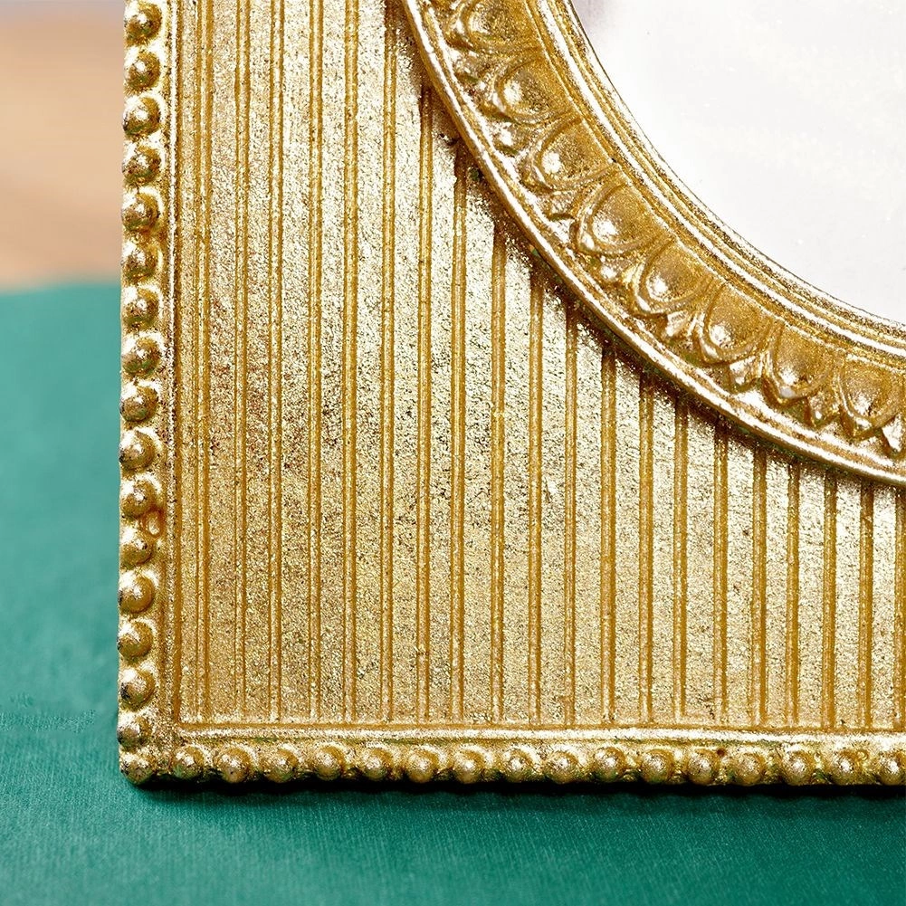 Ta dekoracyjna ramka podkreśli Twoje ulubione fotografie i doda wnętrzu nuty elegancji. Okrągły wewnętrzny otwór na zdjęcie przyciąga wzrok i zapewnia efektowną prezentację ujęć. Wysokiej jakości wykonanie z kamienia syntetycznego w odcieniu szampańskiego złota z drobnym połyskiem wygląda luksusowo i jest jednocześnie trwałe.