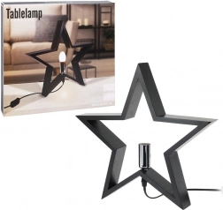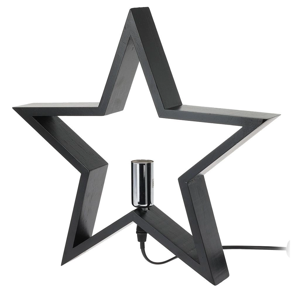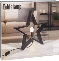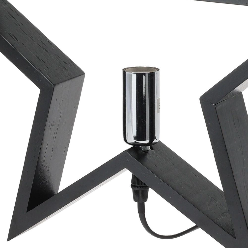 Stylowa lampka stołowa w kształcie gwiazdy w czarnym kolorze z wysokiej jakości drewna rozświetli każde wnętrze. Oferuje efektowny design, zasilanie sieciowe z włącznikiem, gwint E14 (żarówka nie jest w zestawie) oraz przewód zasilający 1,5 m. Świetnie pasuje do salonu, sypialni i gabinetu.