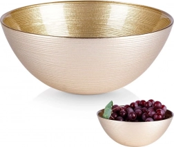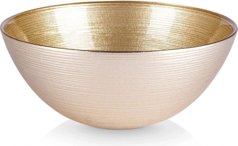 Elegancka szklana miska o pojemności 600 ml i średnicy 15 cm jest idealna do codziennego serwowania i na odświętny stół. Ma matowe złote wykończenie z delikatnymi poziomymi pasami, które nadają jej luksusowy wygląd. Doskonała do sałatek, jogurtów, płatków śniadaniowych oraz słonych przekąsek. Dla zachowania jakości zaleca się mycie ręczne.