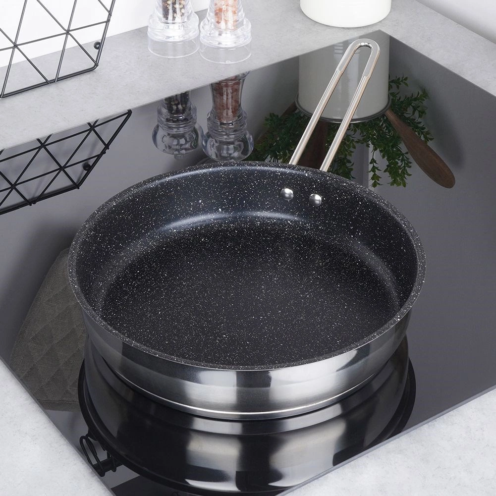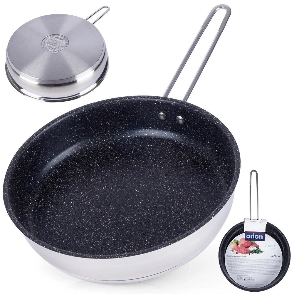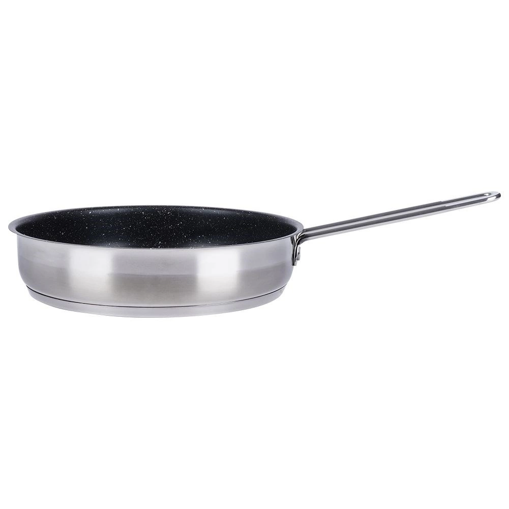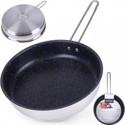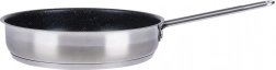 Solidna stalowa patelnia o średnicy 26 cm z granitową nieprzywierającą powłoką do zdrowego gotowania z minimalną ilością tłuszczu. Ma wielowarstwowe dno akutermiczne zapewniające szybkie i równomierne rozprowadzanie ciepła, jest odporna na zarysowania i nadaje się do kuchenek gazowych, elektrycznych, ceramicznych, halogenowych i indukcyjnych. Można ją myć w zmywarce i używać również w piekarniku.