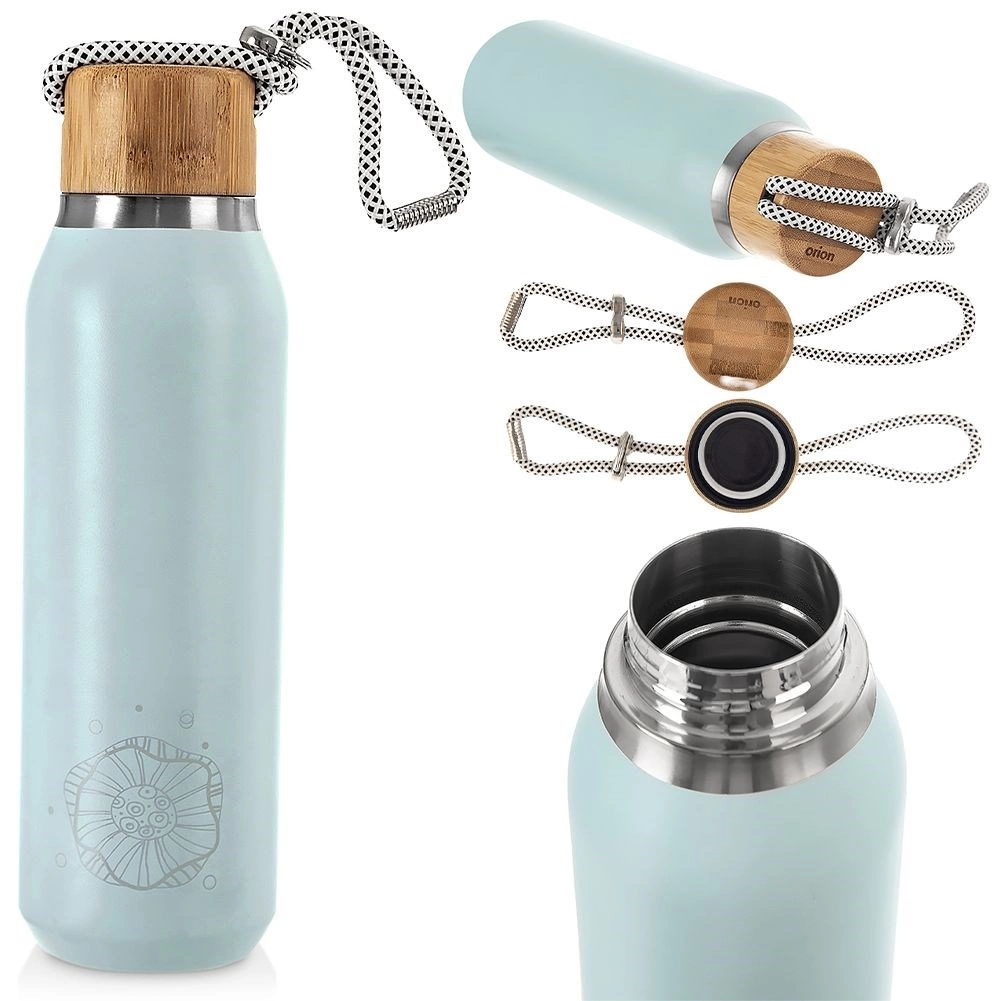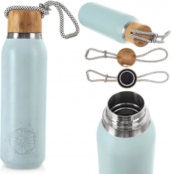 Szeroki wlew ułatwia napełnianie i czyszczenie oraz pozwala włożyć kostki lodu lub kawałki owoców. Praktyczna bambusowa zakrętka ze sznurkiem do wygodnego przenoszenia jest wyposażona w silikonowe uszczelnienie dla niezawodnej szczelności. Idealna na wycieczki, do pracy, szkoły i na sport.