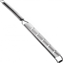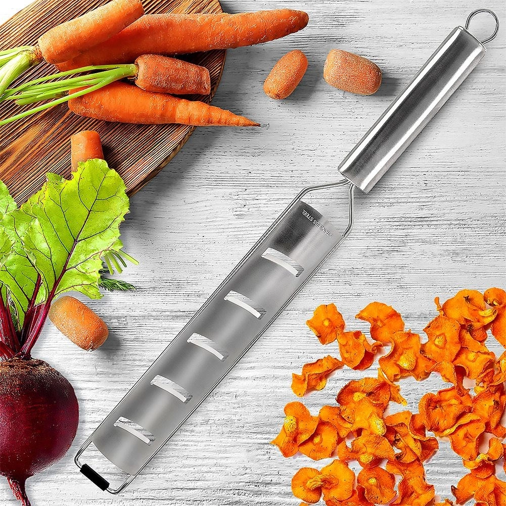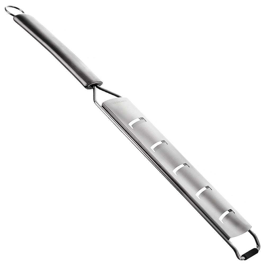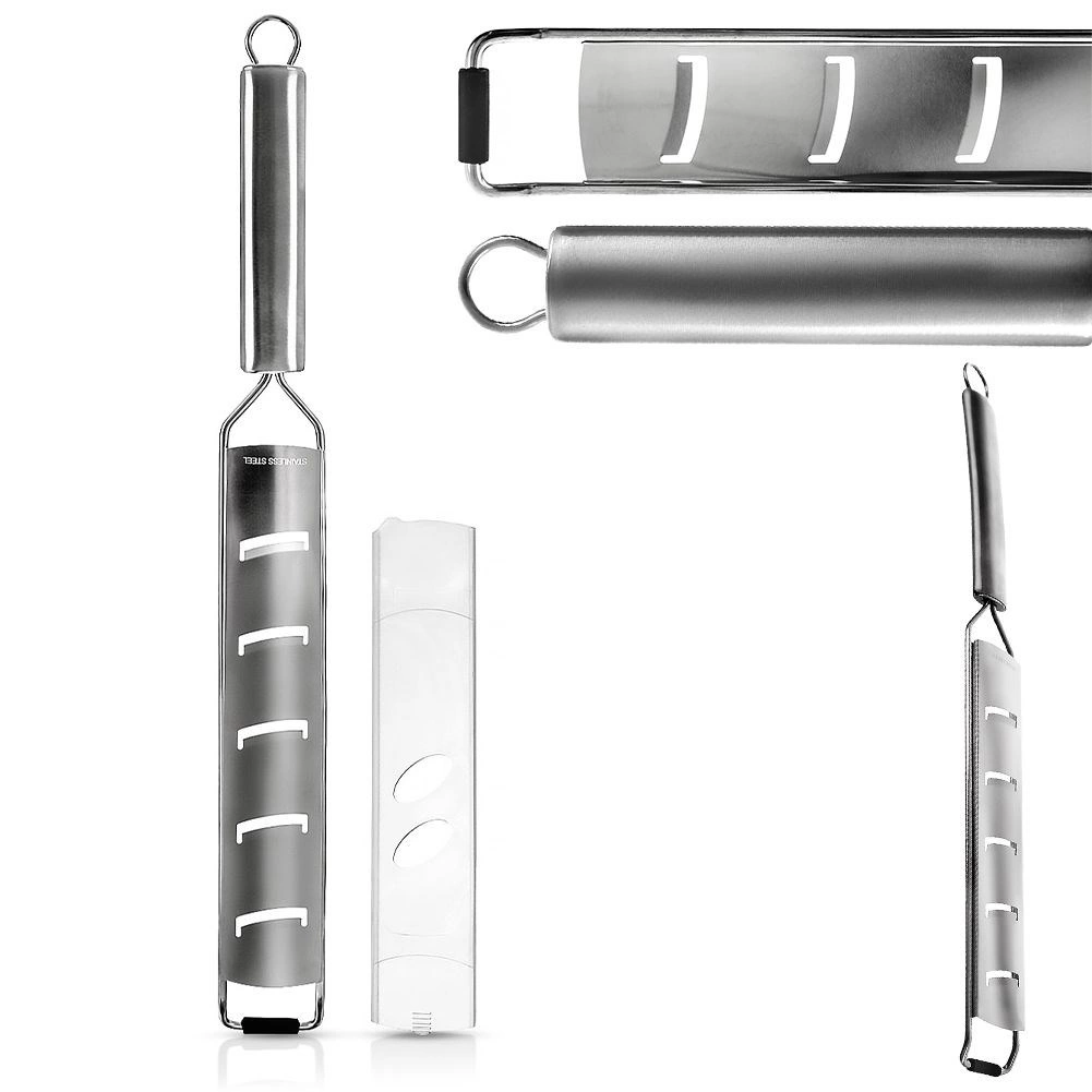Praktyczne płaskie tarko z wysokiej jakości stali nierdzewnej z pięcioma ostrymi ostrzami do równomiernego plasterkowania. Dzięki długiej rączce świetnie leży w dłoni, ma gumową końcówkę dla stabilności, ochronne etui do bezpiecznego przechowywania i można je myć w zmywarce. Idealne do twardych serów, warzyw, owoców, czosnku i imbiru.