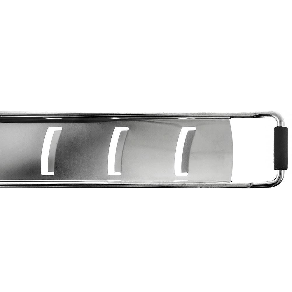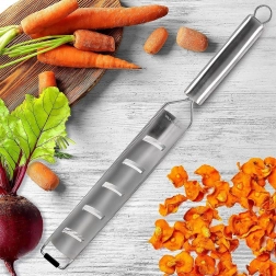 Uniwersalne tarko ze stali nierdzewnej o płaskim profilu zapewnia precyzyjne i szybkie plasterkowanie bezpośrednio do miski, patelni lub garnka. Pięć ostrych ostrzy gwarantuje czyste cięcie bez miażdżenia składników, a gumowa końcówka chroni powierzchnię naczyń przed zarysowaniami i zwiększa stabilność podczas pracy.