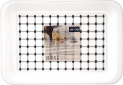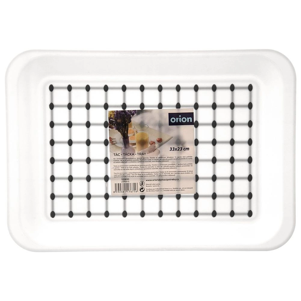 Praktyczna biała taca do serwowania o wymiarach 33 × 23 × 2 cm z wytrzymałego plastiku z szarymi elementami oferuje antypoślizgową powierzchnię od góry i od spodu, podwyższone krawędzie dla bezpiecznego przenoszenia oraz uniwersalne zastosowanie do napojów, śniadań i deserów. Idealna do domu i gastronomii, inspirowana jakością marki ORION.