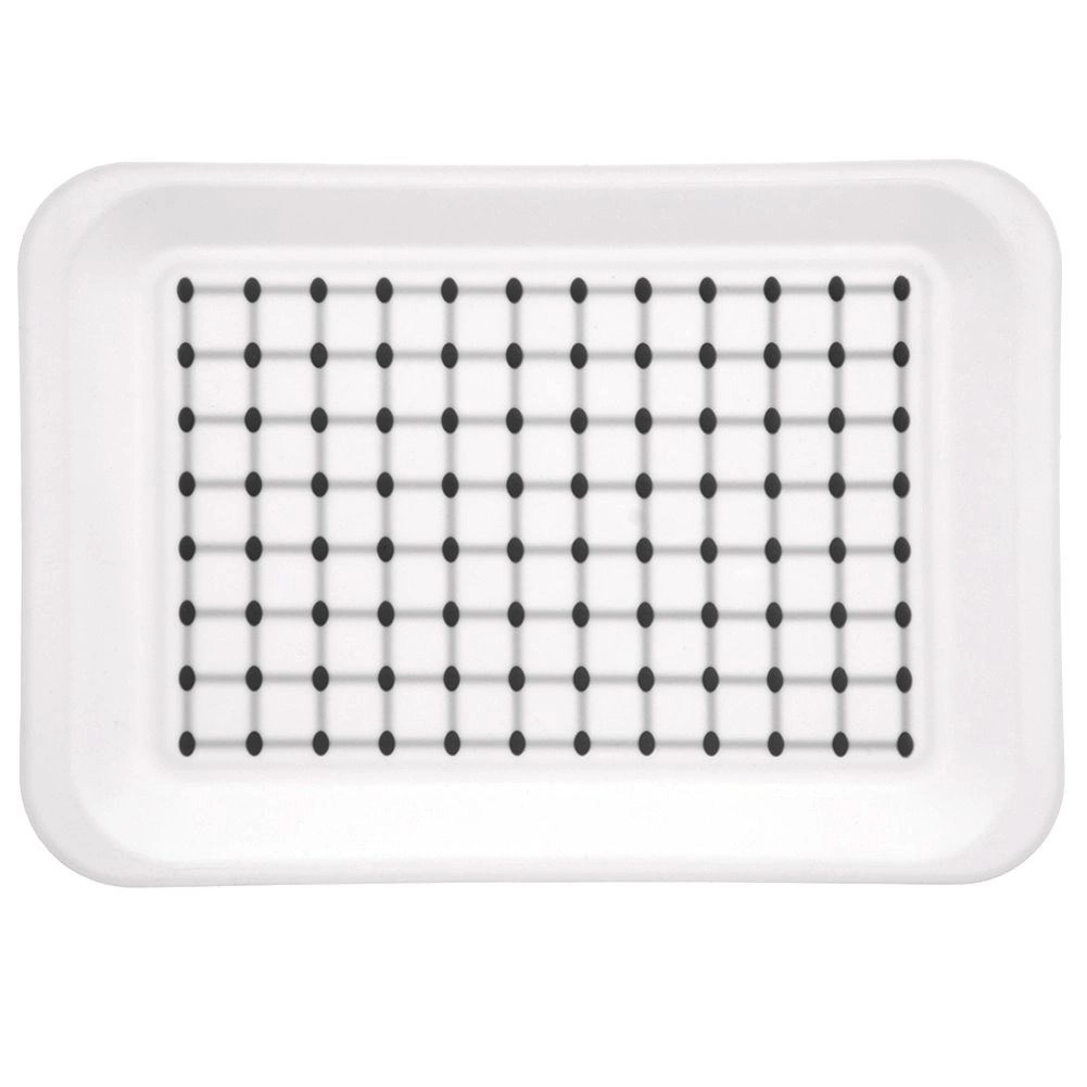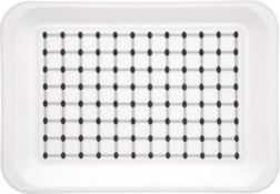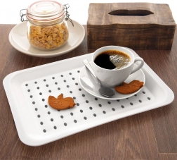 Wytrzymała taca kuchenna z wysokiej jakości plastiku w białym kolorze z szarymi detalami została zaprojektowana do bezpiecznego i wygodnego serwowania. Dzięki antypoślizgowej powłoce na górnej oraz dolnej stronie filiżanki, szklanki i talerze pozostają stabilne, a taca nie ślizga się po stole. Podwyższone krawędzie ułatwiają chwyt i minimalizują ryzyko rozlania.