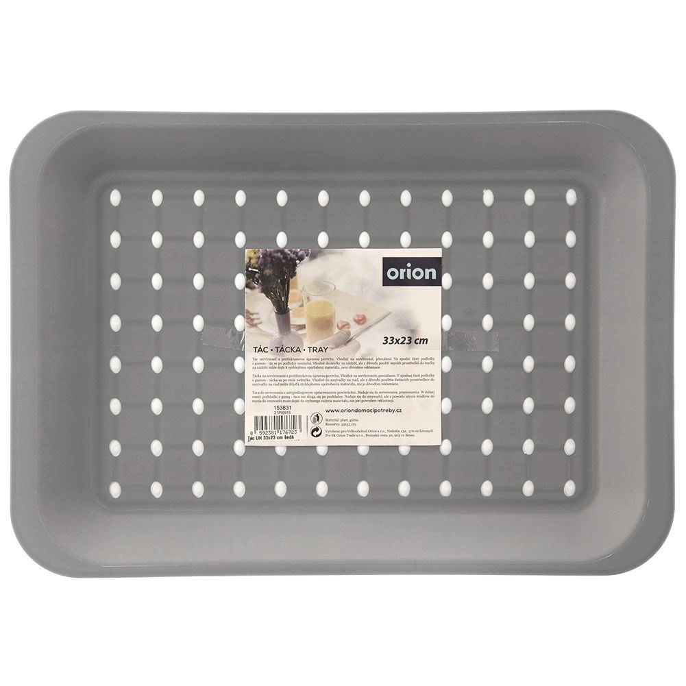 Praktyczna szara taca do serwowania o wymiarach 33 × 23 × 2 cm z wytrzymałego plastiku, idealna do codziennego użytku w domu i gastronomii. Dzięki antypoślizgowej powierzchni na górze i od spodu kubki, szklanki i talerze pozostają stabilnie na miejscu, a podwyższone krawędzie ułatwiają wygodne i pewne przenoszenie. Lekki materiał, łatwa pielęgnacja i uniwersalne zastosowanie do śniadań, deserów oraz kawy.
