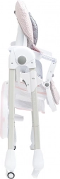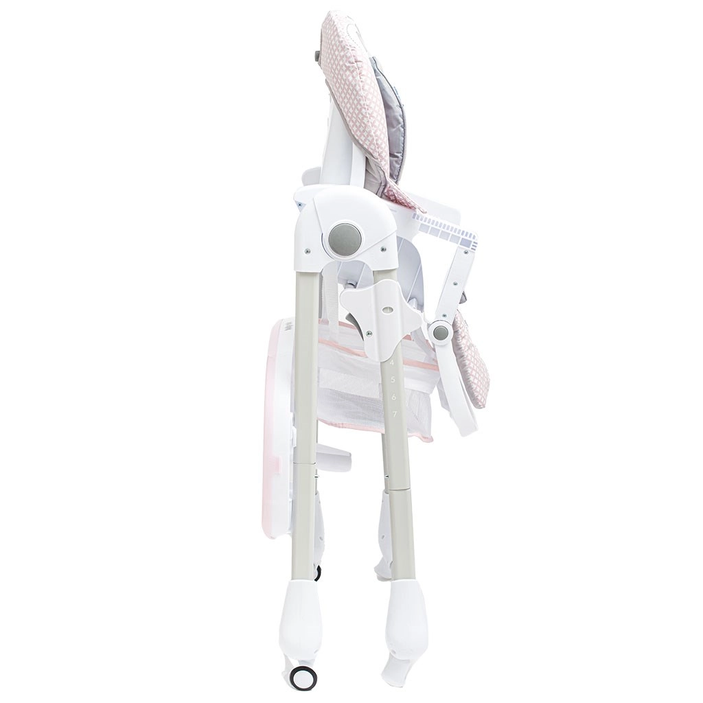 Dla maksymalnej praktyczności dostępna jest podwójna, łatwa do mycia tacka, pojemny kosz na drobiazgi pod siedziskiem oraz kółka z hamulcem ułatwiające przemieszczanie i bezpieczne unieruchomienie. Dzięki 7 poziomom wysokości i kompaktowemu składaniu krzesełko dopasowuje się do stołu jadalnianego i mniejszych przestrzeni.