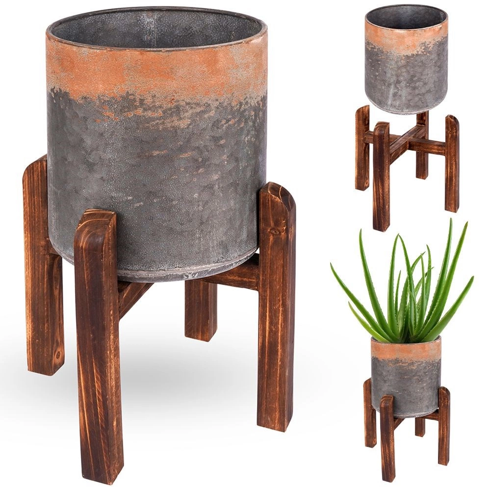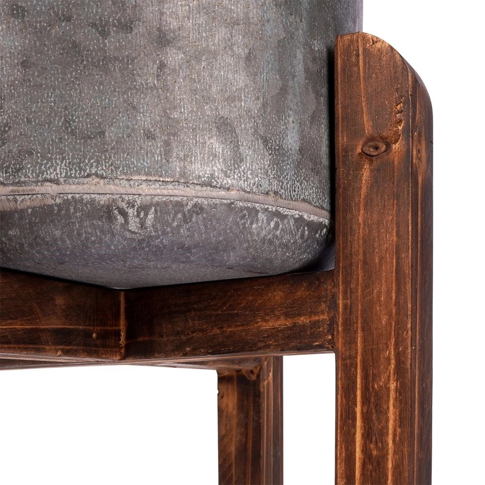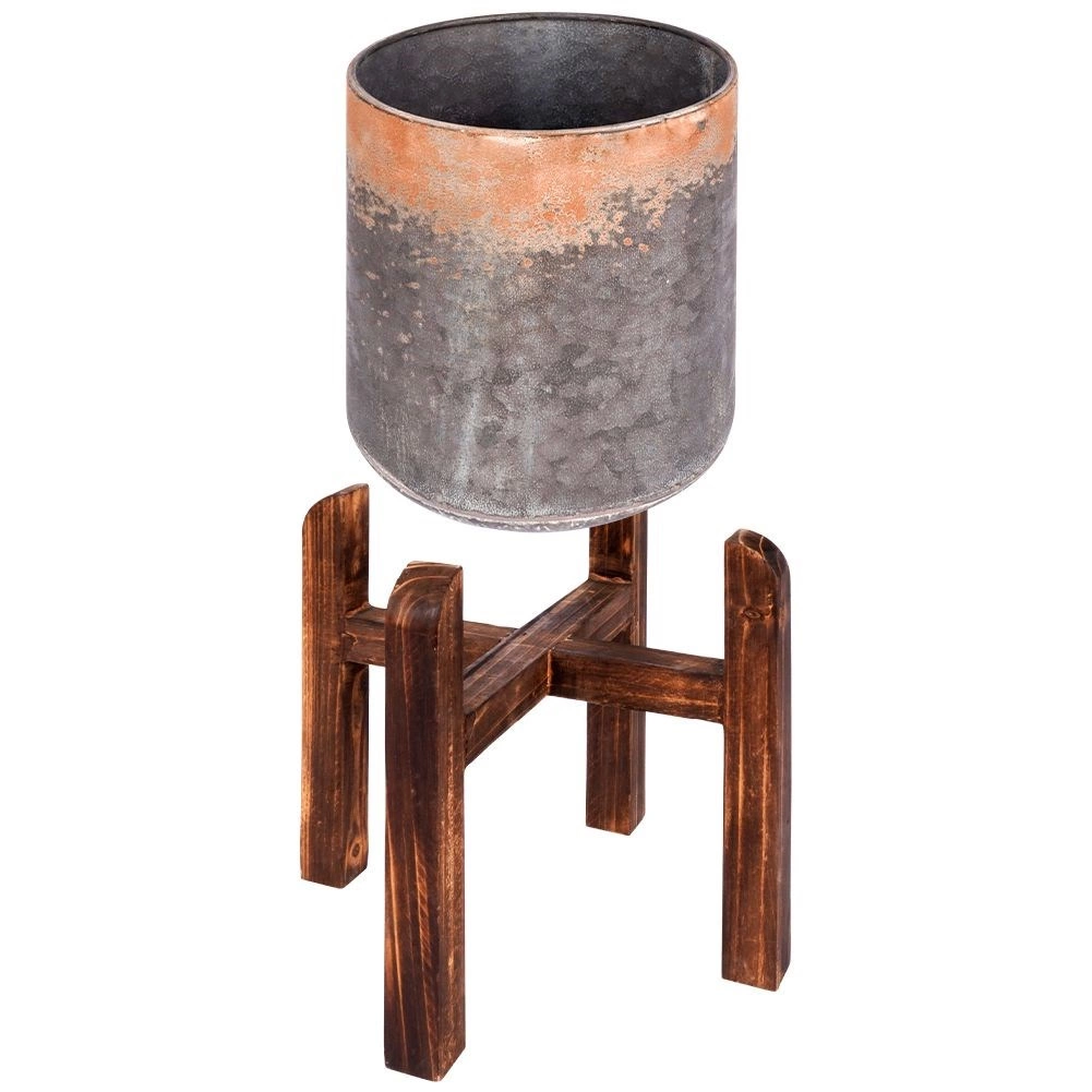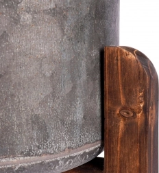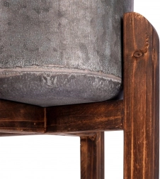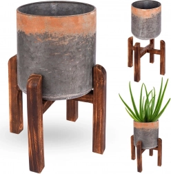 Wnieś do wnętrza odrobinę stylu dzięki osłonce na stojaku w retro klimacie. Stalowy pojemnik z efektem srebrnej patyny oraz naturalny drewniany stojak tworzą wyrazisty element dekoracyjny, który świetnie sprawdzi się na parapecie, komodzie i na podłodze. Dzięki podwyższeniu na stojaku Twoje rośliny zyskają więcej przestrzeni i uwagi.