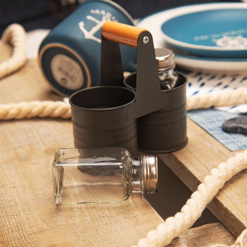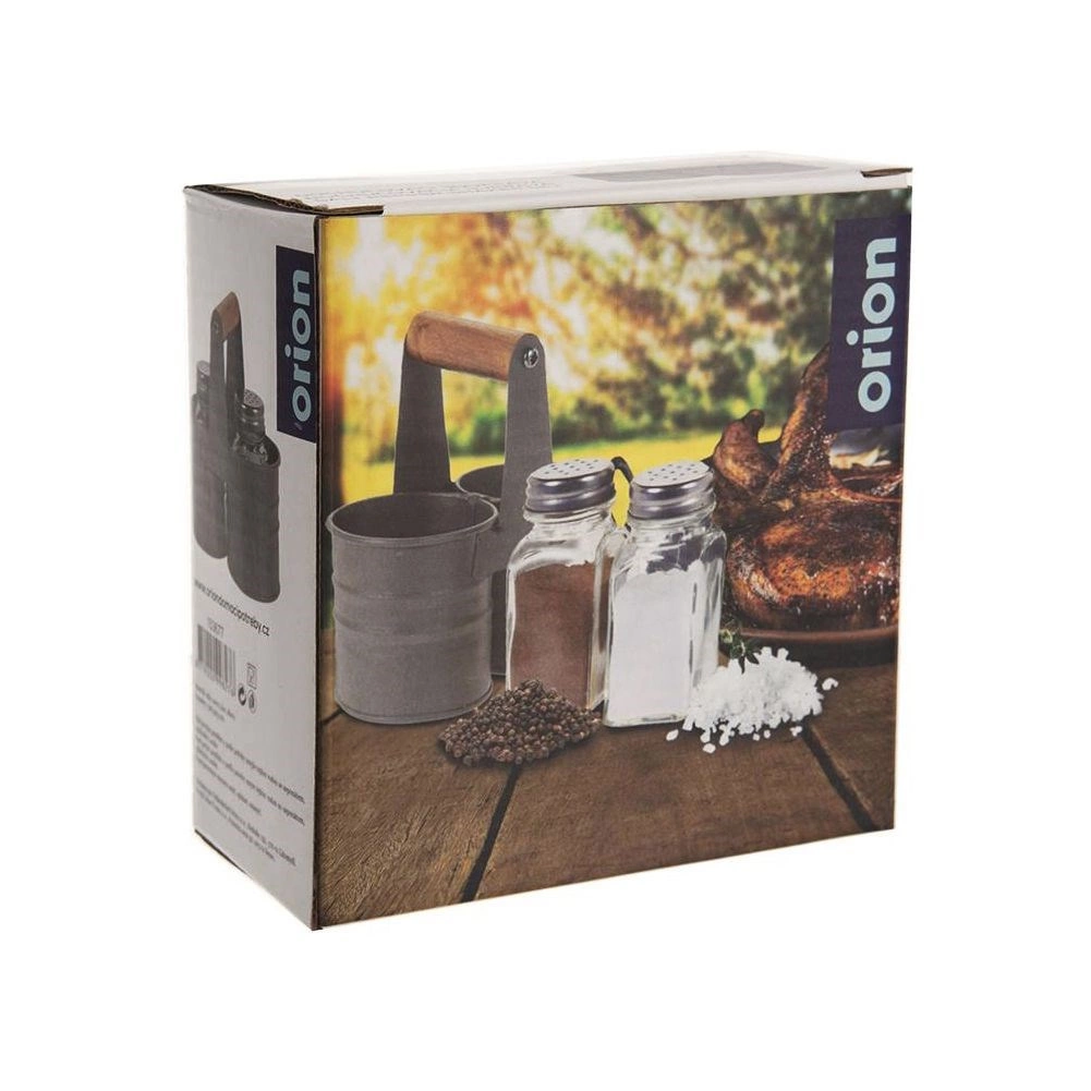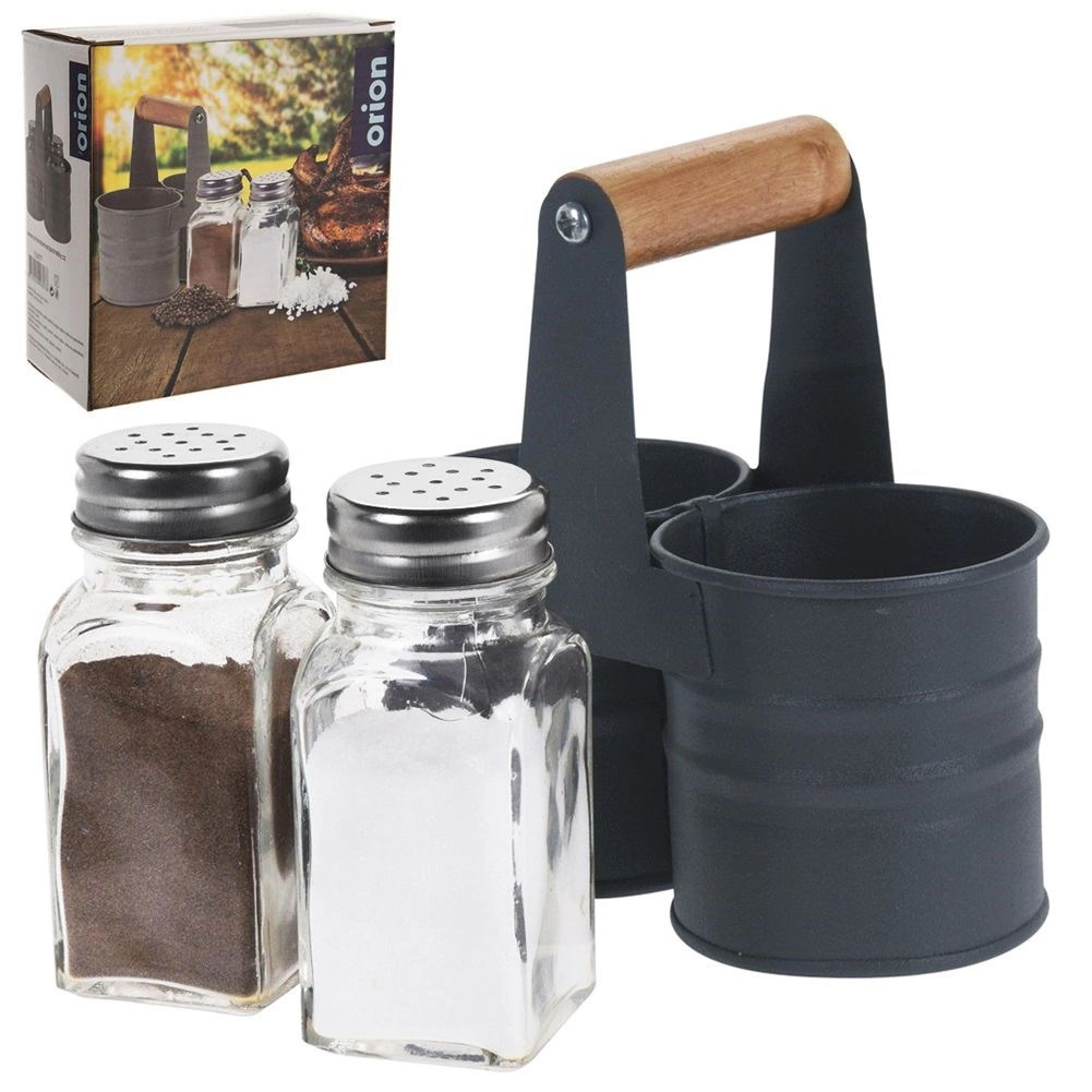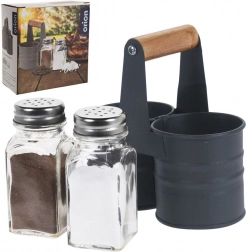 Elegancki zestaw solniczki i pieprzniczki ze szklanymi pojemnikami w praktycznym metalowym stojaku z drewnianym uchwytem. Kompaktowe wymiary 13 × 6 × 12,5 cm, pojemność każdego pojemnika 75 ml. Wygodne dozowanie dzięki perforowanym stalowym nakrętkom, łatwe czyszczenie i uniwersalne zastosowanie w domu oraz gastronomii.