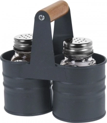 Stylowy zestaw do codziennego doprawiania: dwie kwadratowe szklane przyprawniki z trwałymi stalowymi nakrętkami w stabilnym metalowym stojaku. Drewniany uchwyt zapewnia bezpieczne i wygodne przenoszenie po kuchni i stole. Dzięki przezroczystemu szkłu masz zawsze wgląd w ilość soli i pieprzu.