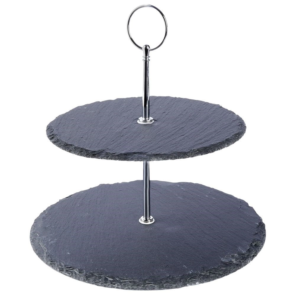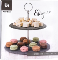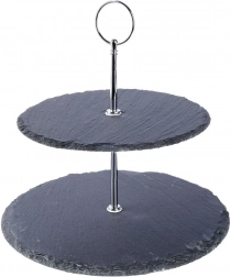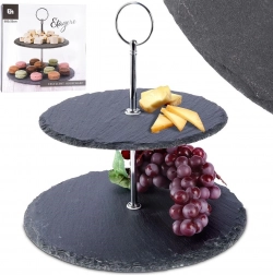Stylowy dwupiętrowy etażer z naturalnego łupku do serwowania i prezentacji deserów, owoców oraz przystawek. Oferuje elegancki wygląd, dwa poziomy dla efektownej aranżacji oraz solidny metalowy uchwyt ułatwiający przenoszenie. Dzięki łatwej pielęgnacji idealnie sprawdzi się w domu i w zastosowaniach profesjonalnych.