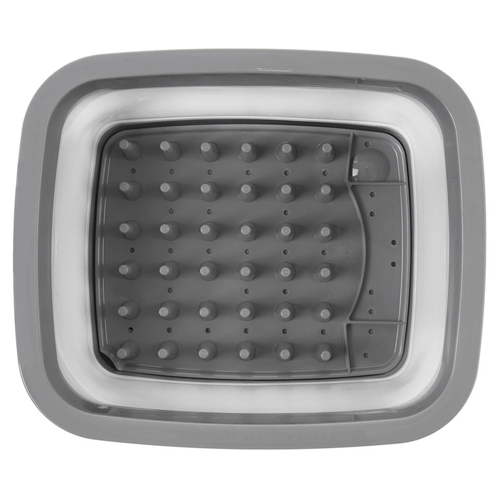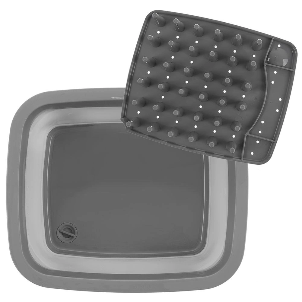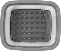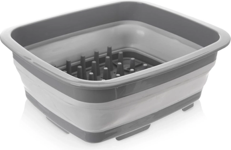 Wyjmowana wkładka z bolcami podtrzymuje talerze i zapewnia szybkie schnięcie. Po wyjęciu wkładki suszarka zamienia się w praktyczny zlew lub misę – świetne rozwiązanie do małych kuchni, na działkę, do ogrodu i na kemping. Wysokiej jakości termoelastyczny silikon i wytrzymałe tworzywo sztuczne są łatwe w utrzymaniu, wkładkę można myć w zmywarce.
