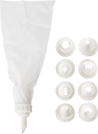 W opakowaniu znajdziesz 9 różnych końcówek do gwiazdek, linii, kropek i motywów kwiatowych. Praktyczne rozwiązanie umożliwia szybką wymianę końcówki także w trakcie pracy – bez konieczności wyjmowania nadzienia z rękawa. Zestaw świetnie sprawdzi się też do formowania bez, nadziewania ptysiów lub dekorowania wytrawnych przekąsek.