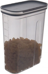 Zadbaj o porządek i świeżość w swojej kuchni. Ten wysoki, przezroczysty pojemnik z ciemnoszarą pokrywą oferuje łatwe dozowanie dzięki uchylnej wylewce oraz precyzyjną kontrolę ilości dzięki bocznej skali od 500 do 4000 ml. Profilowany kształt dobrze leży w dłoni i pozwala wygodnie wysypywać bez rozsypywania.