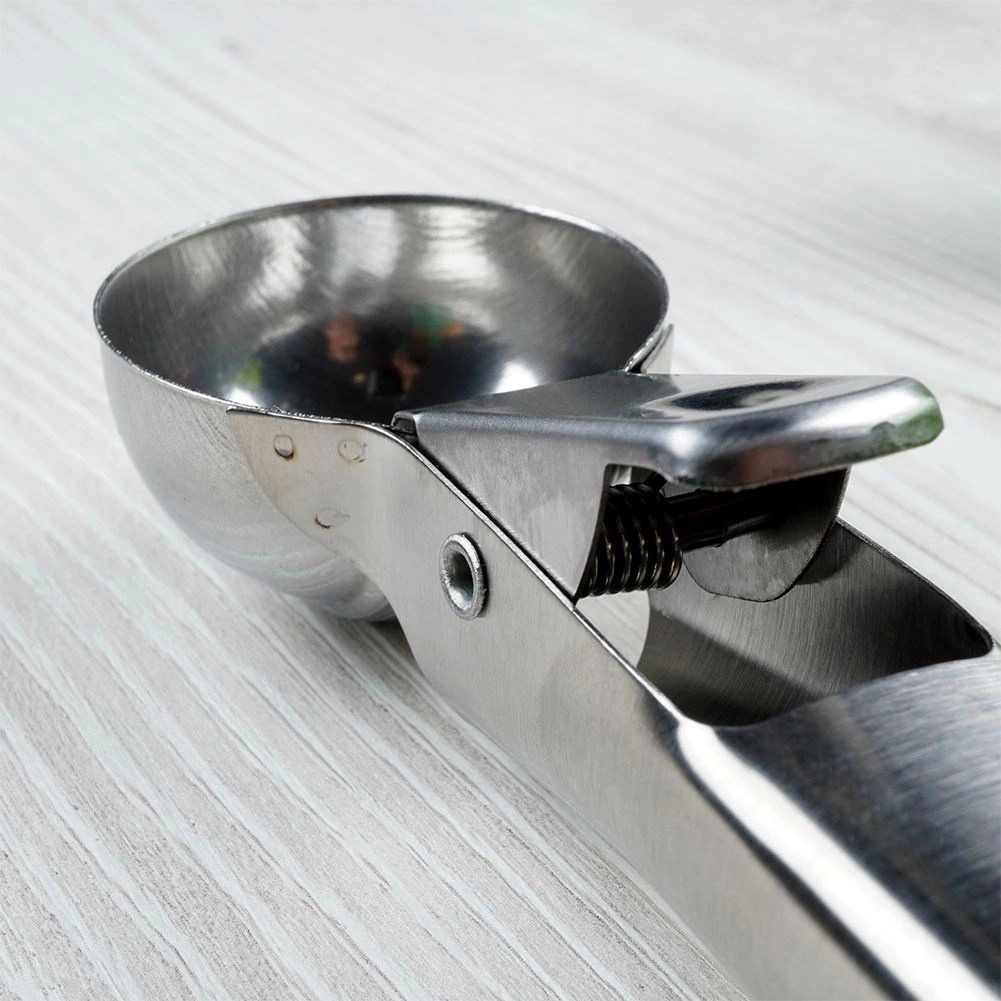 Zaokrąglona główka i dźwigniowy wyrzutnik tworzą pięknie uformowane porcje i łatwo je uwalniają nawet z twardszych lodów.