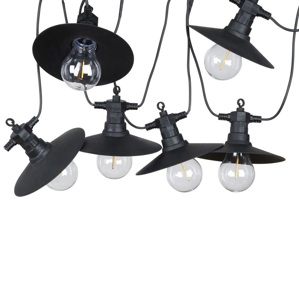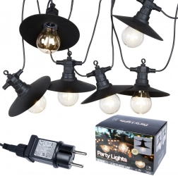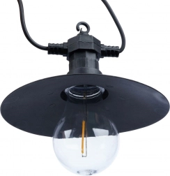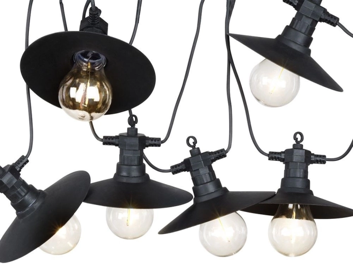 Ta wytrzymała girlanda zewnętrzna łączy eleganckie czarne metalowe klosze (Ø 15 cm) z przezroczystymi żarówkami LED (Ø 6 cm, długość 7 cm), które kierują światło w dół i tworzą przyjemne, ciepłe oświetlenie. Dzięki odstępowi 50 cm między żarówkami równomiernie doświetla strefę wypoczynkową, altanę czy ogrodowe przyjęcie.