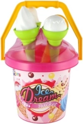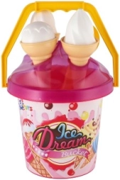Lekkie plastikowe wiaderko z rączką, 3 rożki oraz łopatka do lodów są perfekcyjne do piaskownicy, na plażę i do ogrodu. Dzięki certyfikatowi CE zestaw jest odpowiedni i bezpieczny dla najmłodszych.
