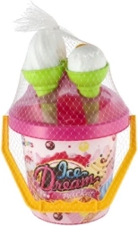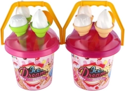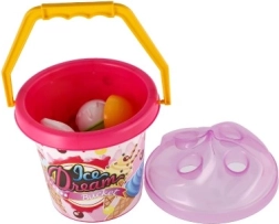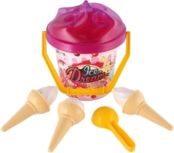 Ten kolorowy zestaw do piasku ze stylową różową pokrywką i motywem „Ice Dream Bucket” wspiera wyobraźnię, motorykę małą oraz umiejętności społeczne podczas zabawy w kawiarnię, restaurację lub sklep. Pokrywka ma specjalne otwory do formowania gałek, dzięki czemu „lody” z piasku wyglądają jak prawdziwe.