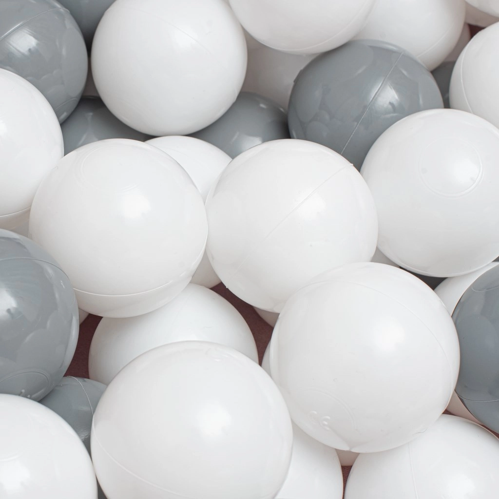 W zestawie znajduje się 150 plastikowych piłeczek w kolorze białym i szarym. Spełniają normy bezpieczeństwa (np. EN-71, CPSC) i wspierają motorykę oraz koordynację.