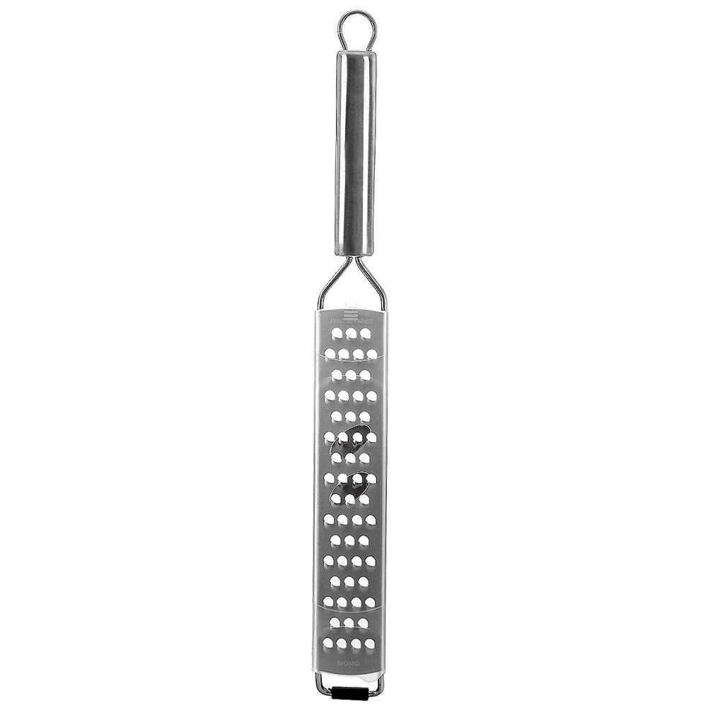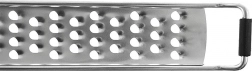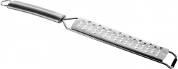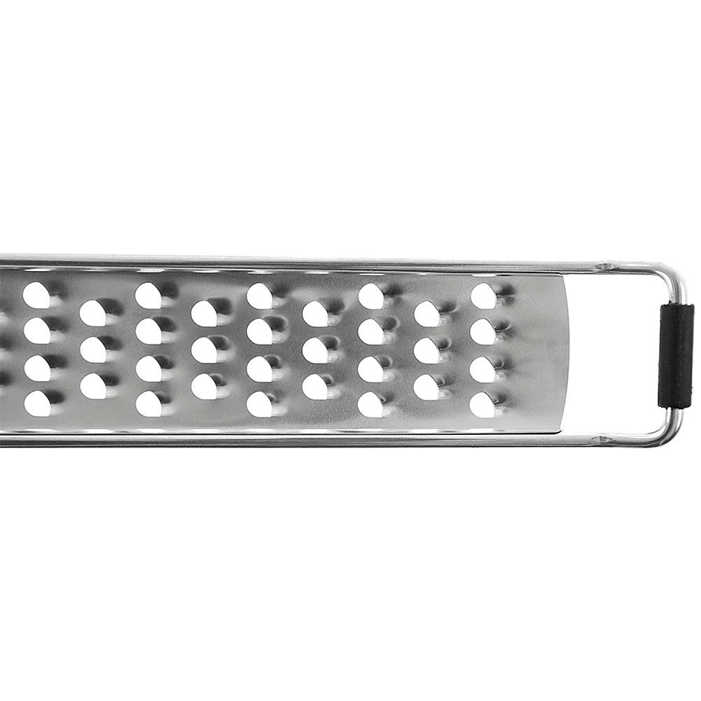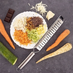 Praktyczna tarka nierdzewna z wąskim płaskim ostrzem i ostrymi zębami pozwala szybko i równomiernie zetrzeć składniki na drobne lub średnie wiórki. Długa ergonomiczna rączka zapewnia pewny chwyt i precyzyjną kontrolę podczas pracy, a gumowa stopka chroni garnki i patelnie przed zarysowaniem.