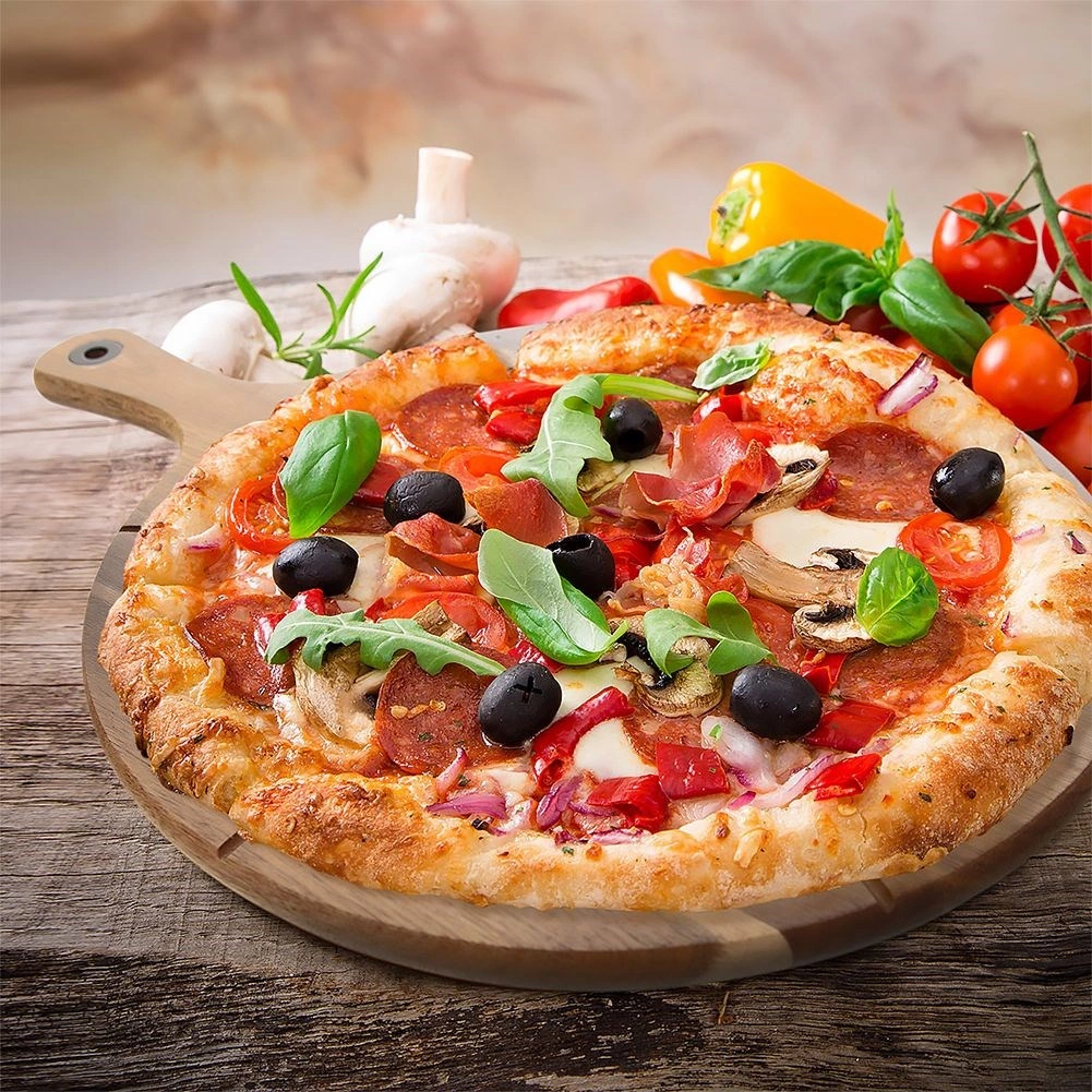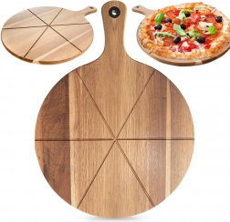 Praktyczna drewniana deska do pizzy z drewna akacjowego z długim uchwytem i prowadzącymi rowkami na 6 równych porcji. Jest dwustronna – jedna strona z prowadnicami do precyzyjnego krojenia, druga gładka do serwowania serów, wędlin lub pieczywa. Lekka, wytrzymała i odporna na wilgoć, wyposażona w oczko do zawieszenia dla łatwego przechowywania.