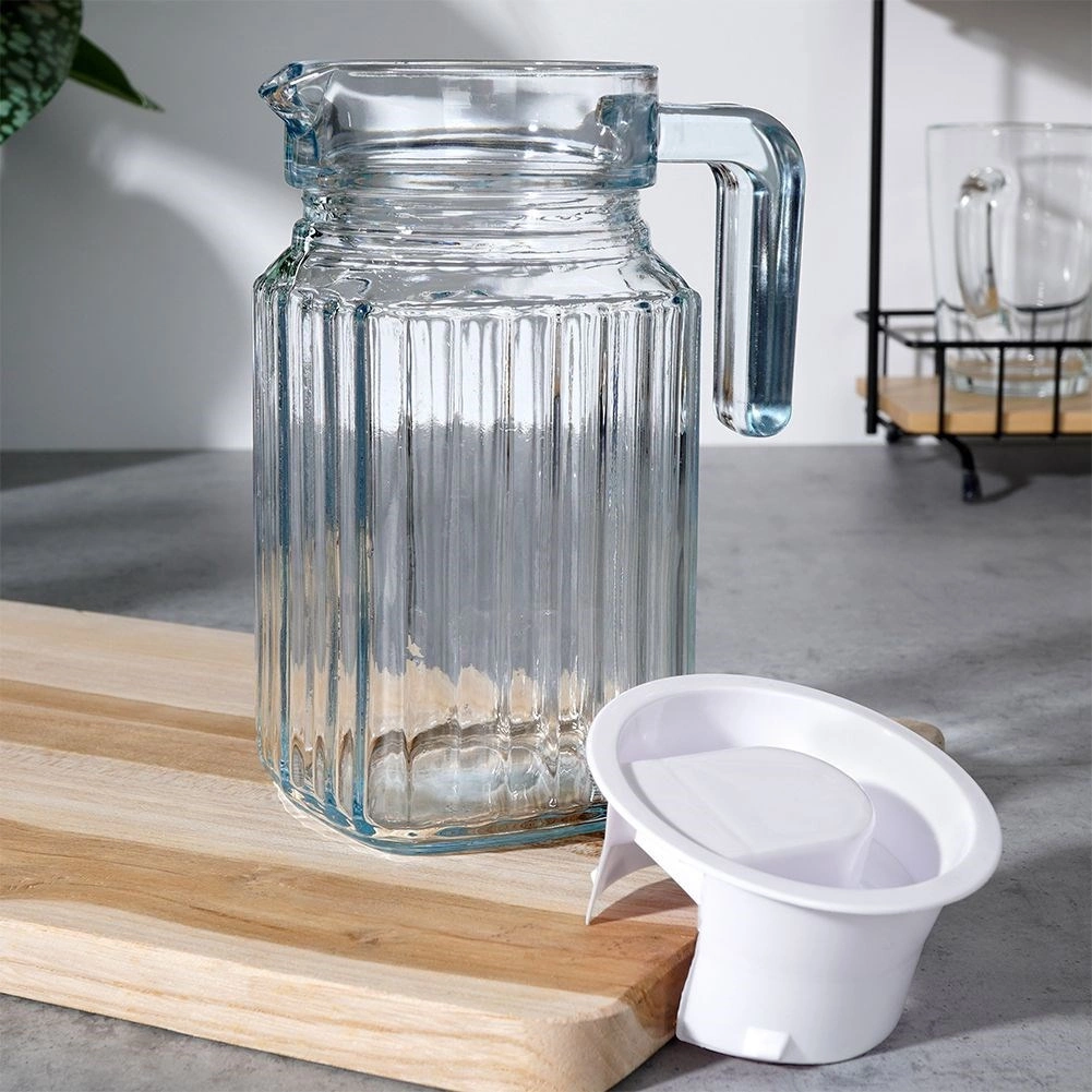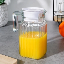Ten szklany dzbanek łączy ponadczasowy design i praktyczność do codziennego użytku. Przejrzyste, wytrzymałe szkło z pionowym ryflowaniem zapewnia pewny chwyt i atrakcyjny wygląd. Praktyczna biała pokrywka chroni napoje i utrzymuje czystość podczas serwowania w domu i na zewnątrz.