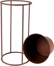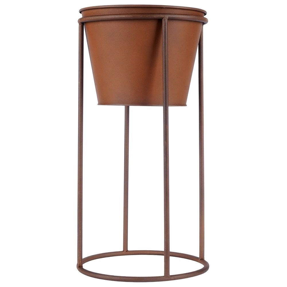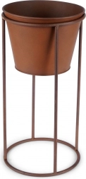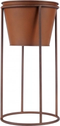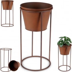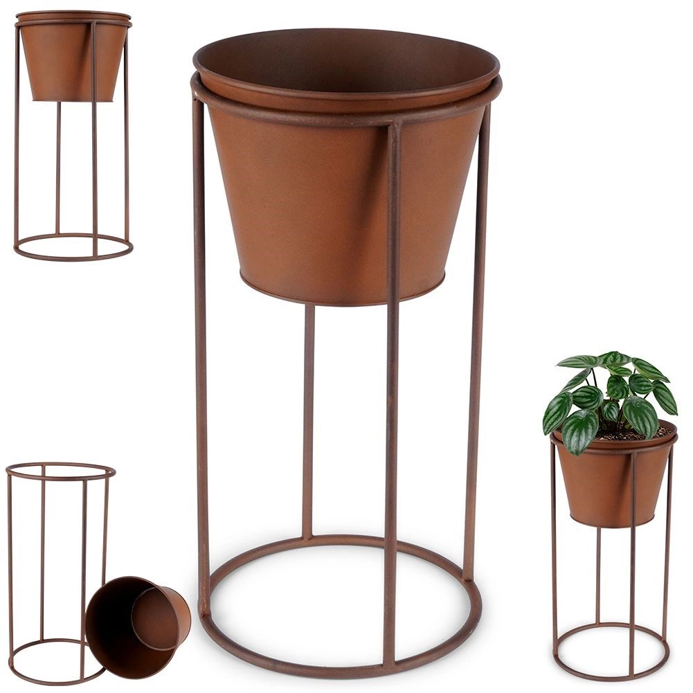 Elegancka metalowa donica na stojaku w stylu retro do stylowej prezentacji roślin w domu i na zewnątrz. Stabilna konstrukcja, rdzawy dekor oraz łatwo wyjmowana wkładka ułatwiają pielęgnację kwiatów, ziół i dekoracyjnej zieleni. Idealna na balkon, taras, do ogrodu i biura.