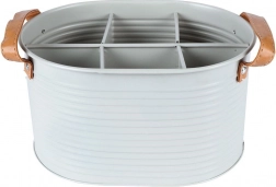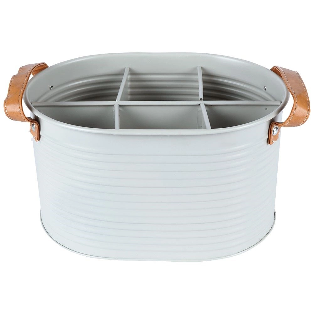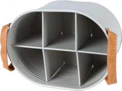 Elegancki i wytrzymały organizer do przenoszenia napojów, który łączy funkcjonalność i stylowy design. Jasnoszary metal z ryflowaną powierzchnią jest odporny na codzienne użytkowanie, a brązowe skórzane uchwyty zapewniają komfortowy chwyt i łatwy transport.