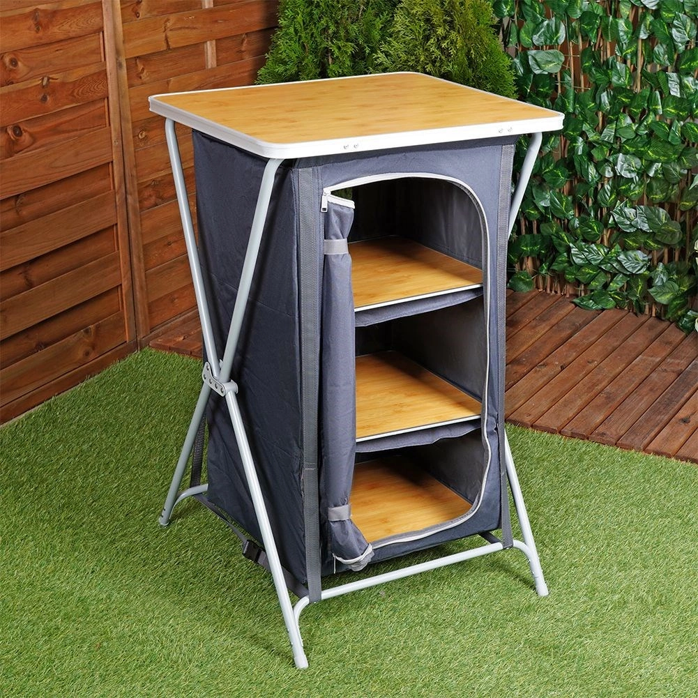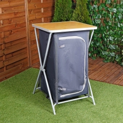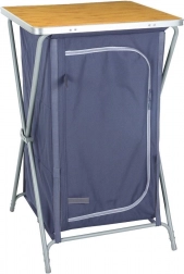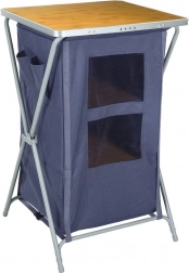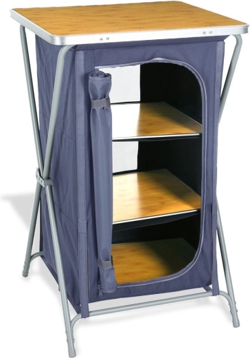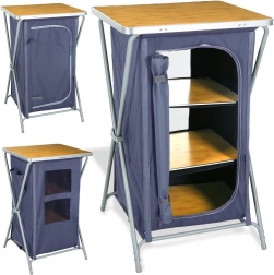 Praktyczna szafka kempingowa ze stabilną stalową ramą, wytrzymałą tkaniną i płytą MDF w dekorze drewna. Oferuje trzy przestronne półki, szybkie składanie, zamknięcie na zamek oraz lekkie przenoszenie wraz z torbą. Idealna do kempingu, kampera i namiotu.