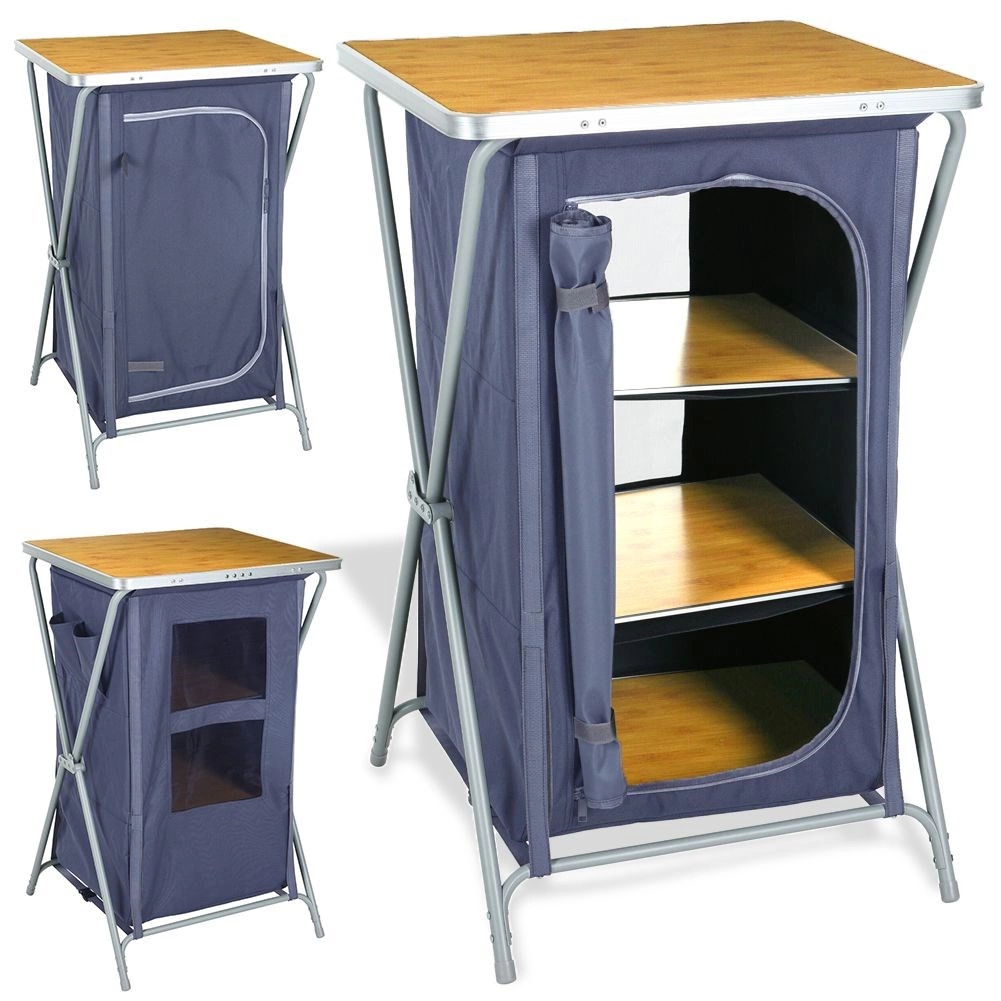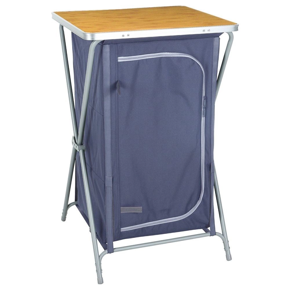 Dzięki tej składanej szafce kempingowej zyskasz przejrzyste i higieniczne przechowywanie wyposażenia w podróży. Wytrzymała stalowa rama, wysokiej jakości poliester w ciemnoszarym kolorze oraz blat z płyty MDF o wyglądzie drewna tworzą solidne, a zarazem mobilne połączenie, które łatwo spakujesz i rozłożysz.