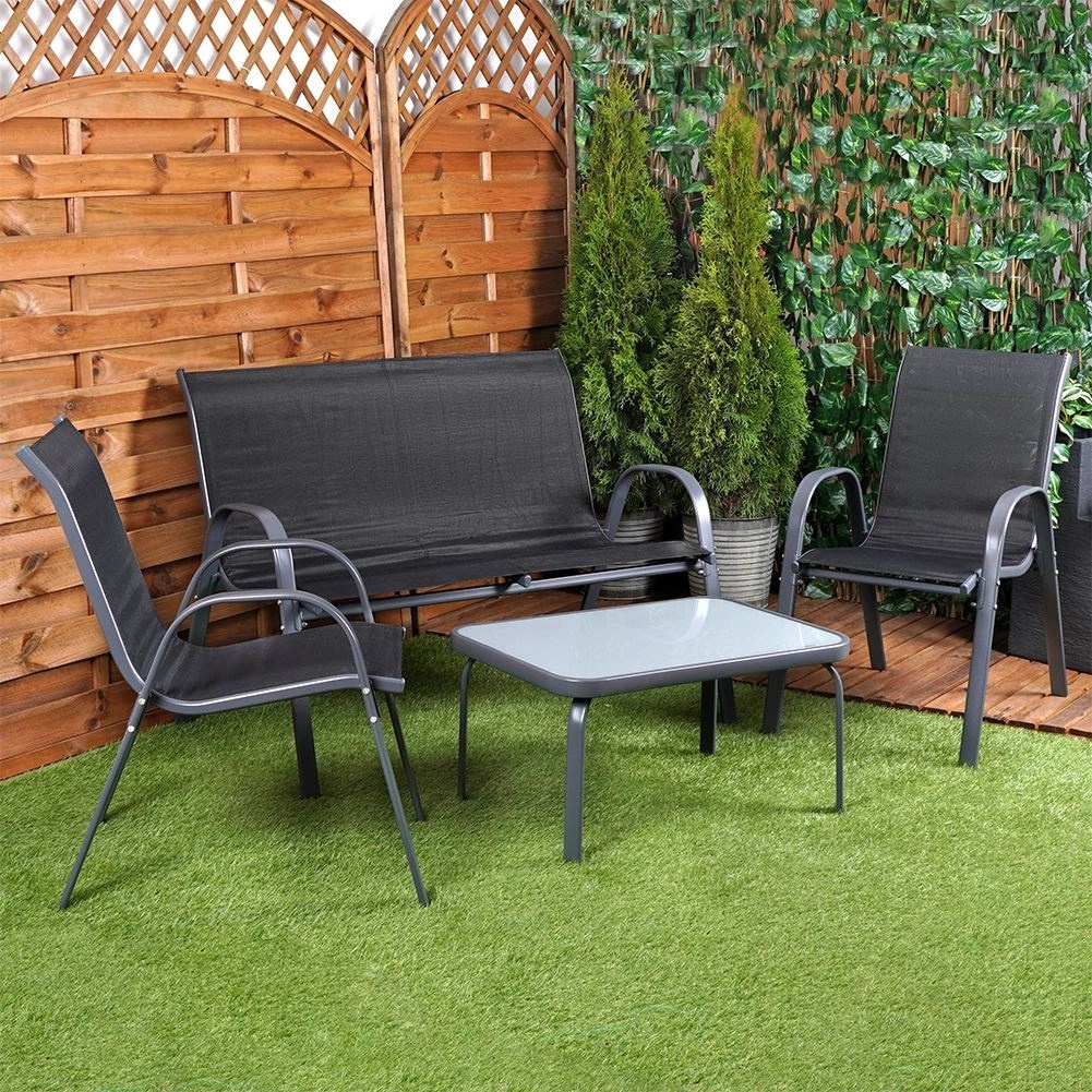 Stylowy zestaw mebli ogrodowych dla 4 osób zawiera 2 fotele, ławę dwuosobową oraz stolik kawowy ze szklanym blatem. Trwała metalowa konstrukcja w szarym kolorze i oddychająca tekstylna siatka z poliestru zapewniają długą żywotność i komfort. Idealny na taras, balkon i do ogrodu.