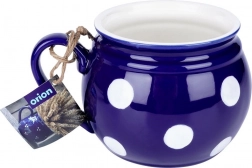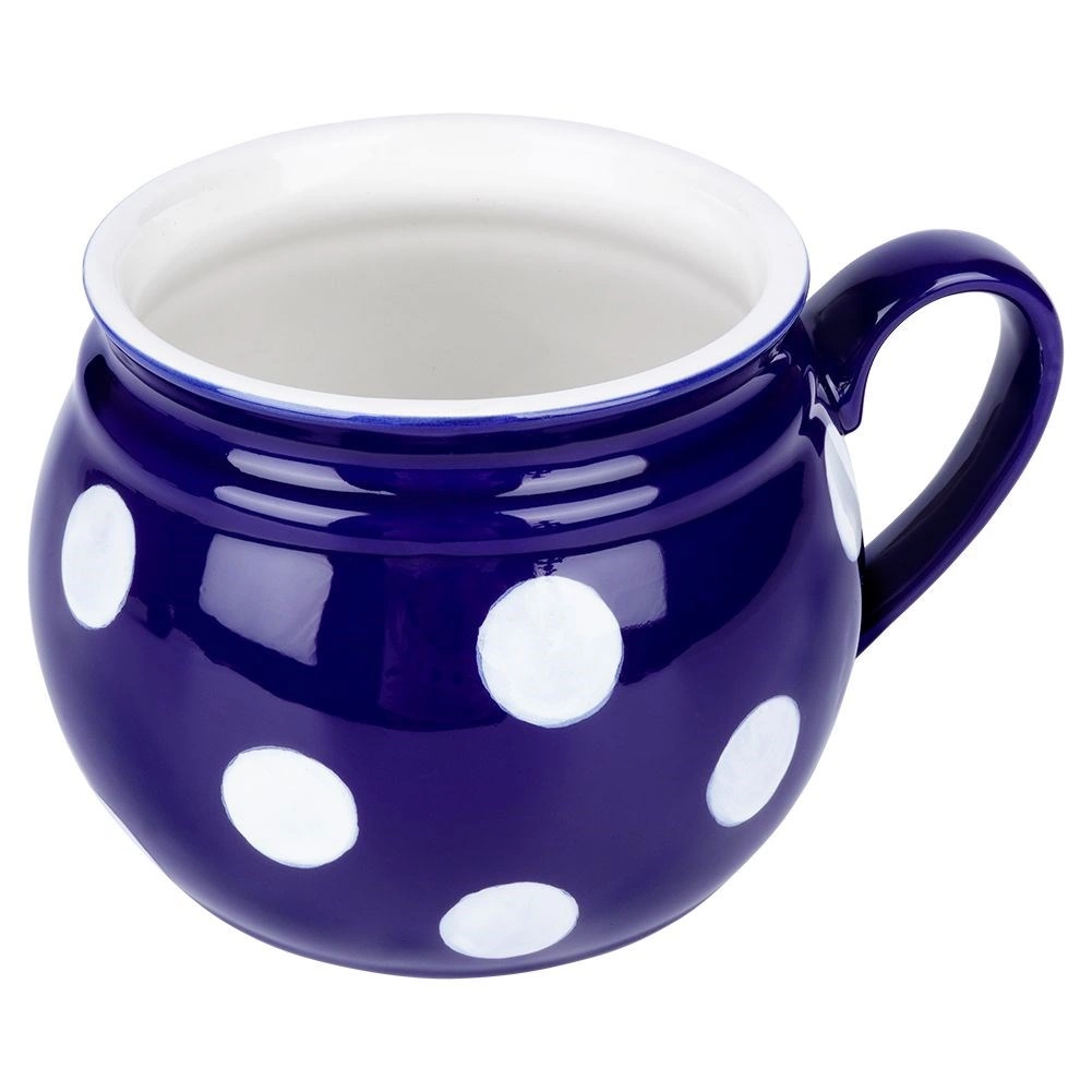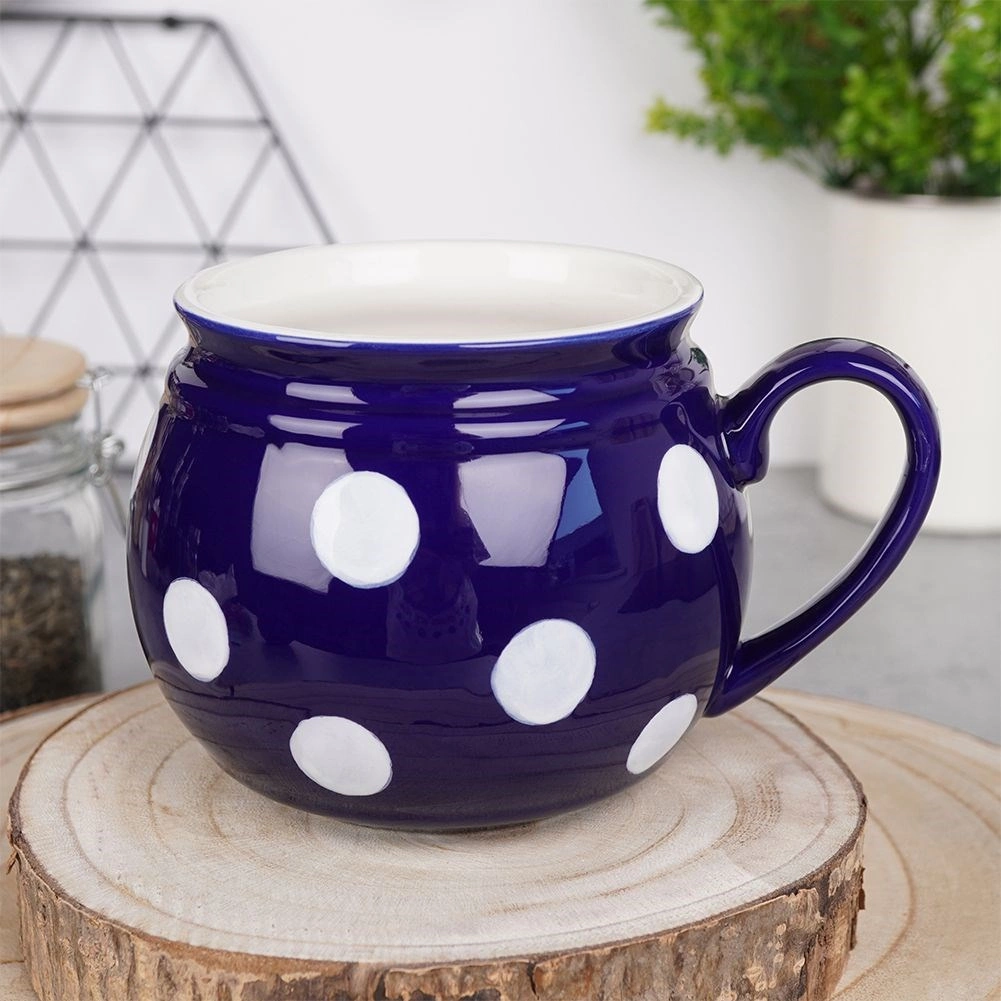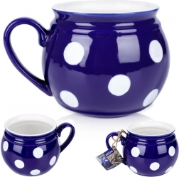 Duży ceramiczny kubek z uchem o pojemności 850 ml w eleganckim, ciemnoniebieskim kolorze z białymi kropkami. Ma wygodne ucho, kształt „baryłki” i nadaje się na herbatę, kawę, kakao oraz grzane wino. Można go myć w zmywarce i używać w mikrofalówce, dlatego jest idealny do codziennego użytku.