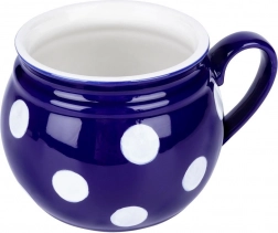 Ciesz się ulubionymi napojami w wielkim stylu. Ten ceramiczny kubek o pojemności 850 ml to świetny wybór dla wszystkich, którzy lubią większe porcje herbaty, kawy lub naparów ziołowych. Klasyczny baryłkowaty kształt, ciemnoniebieska glazura i duże białe kropki dodają nakrytemu stołowi szyku i doskonale komponują się z innymi elementami zastawy.