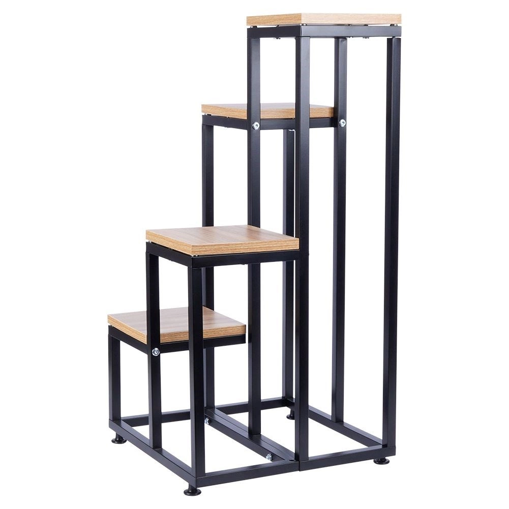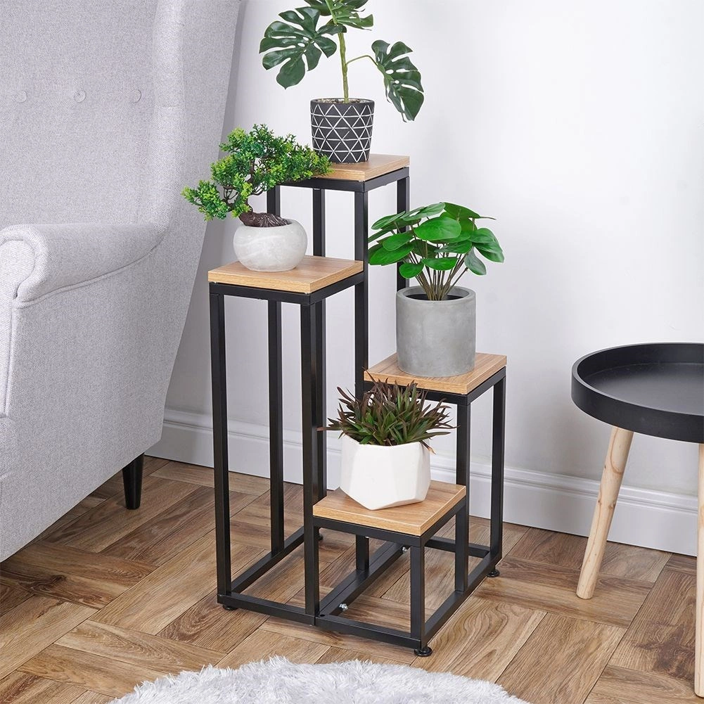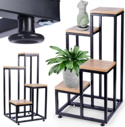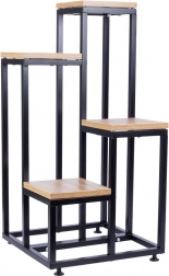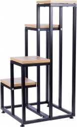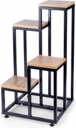Wprowadź do wnętrza nowoczesny loftowy akcent dzięki temu czteropoziomowemu stojakowi na kwiaty. Stabilna metalowa konstrukcja w czarnym kolorze i półki z wysokiej jakości MDF o naturalnej teksturze drewna tworzą ponadczasowe połączenie pasujące do każdego pomieszczenia. Stojak świetnie nadaje się do roślin żywych i sztucznych, a także jako podstawa pod dekoracje.