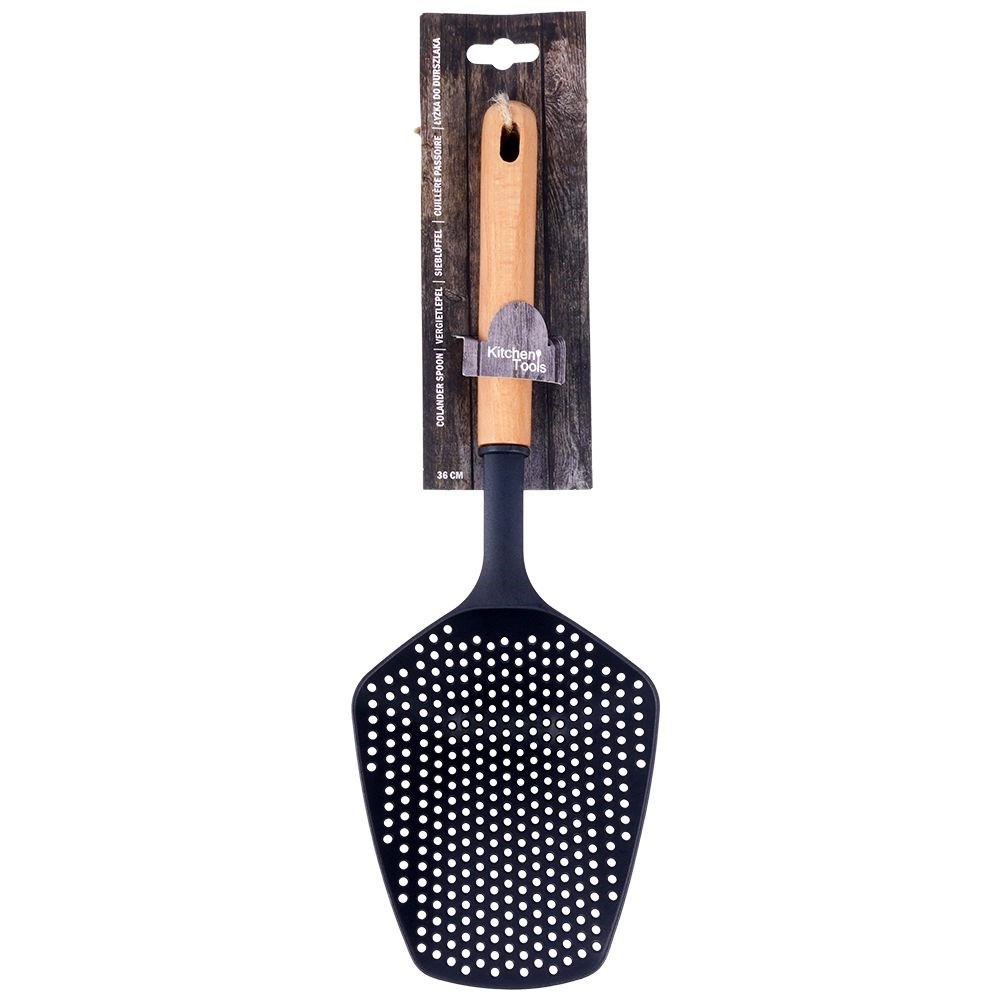 Praktyczna kuchenną łyżka cedzakowa z głowicą sitową o długości 36 cm do łatwego odcedzania i nabierania. Połączenie wytrzymałego nylonu i naturalnej drewnianej rączki jest delikatne dla naczyń z powłokami nieprzywierającymi. Uniwersalne zastosowanie, ergonomiczny uchwyt, odporność na wysokie temperatury oraz możliwość zawieszenia czynią z tej łyżki niezawodnego pomocnika w każdej kuchni.