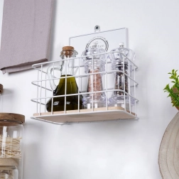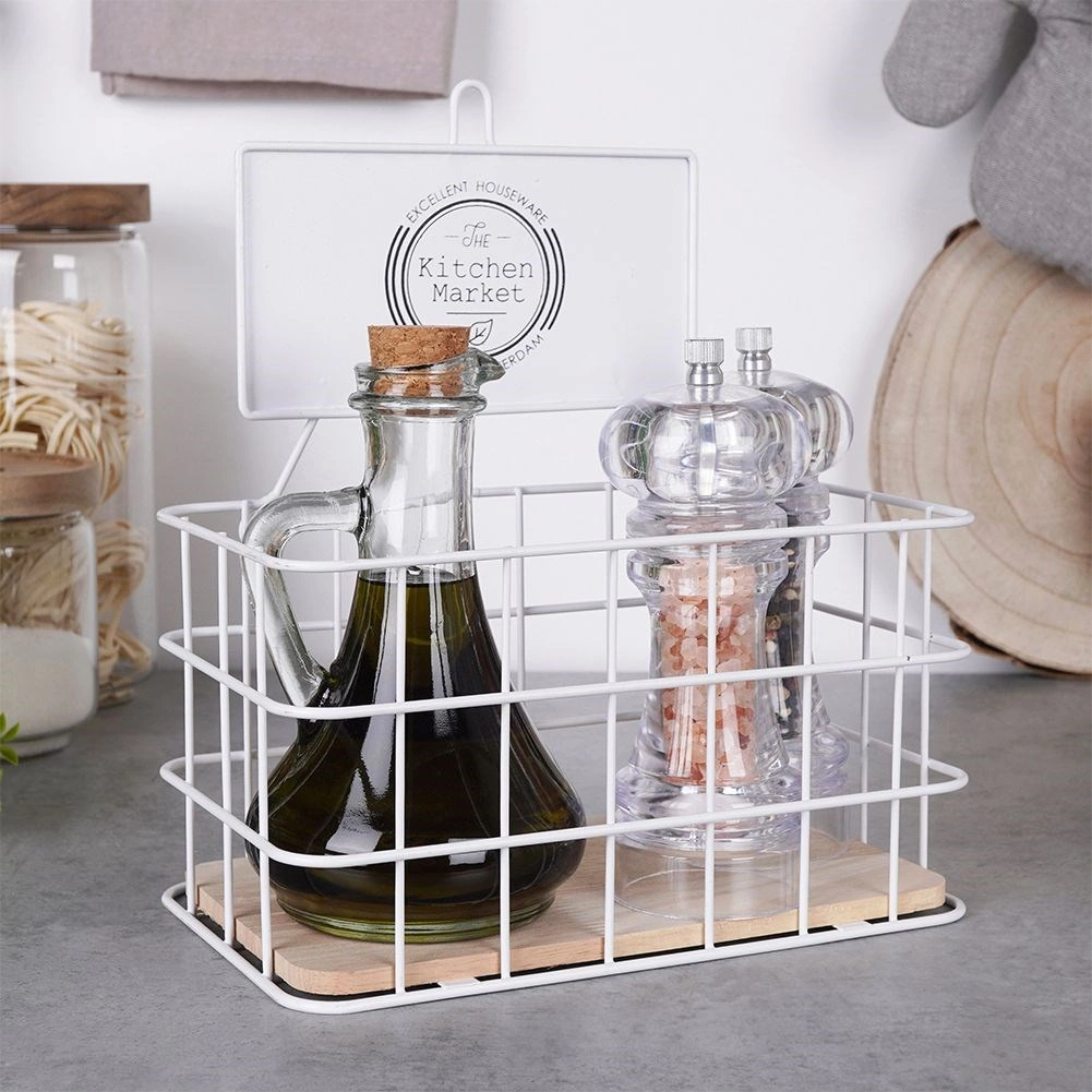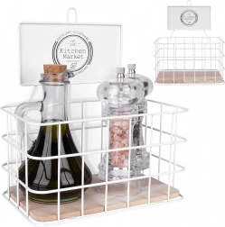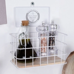 Otwarty druciany koszyk utrzymuje przyprawy i drobiazgi zawsze w zasięgu wzroku i ręki, nie zajmując niepotrzebnie dużo miejsca na blacie.