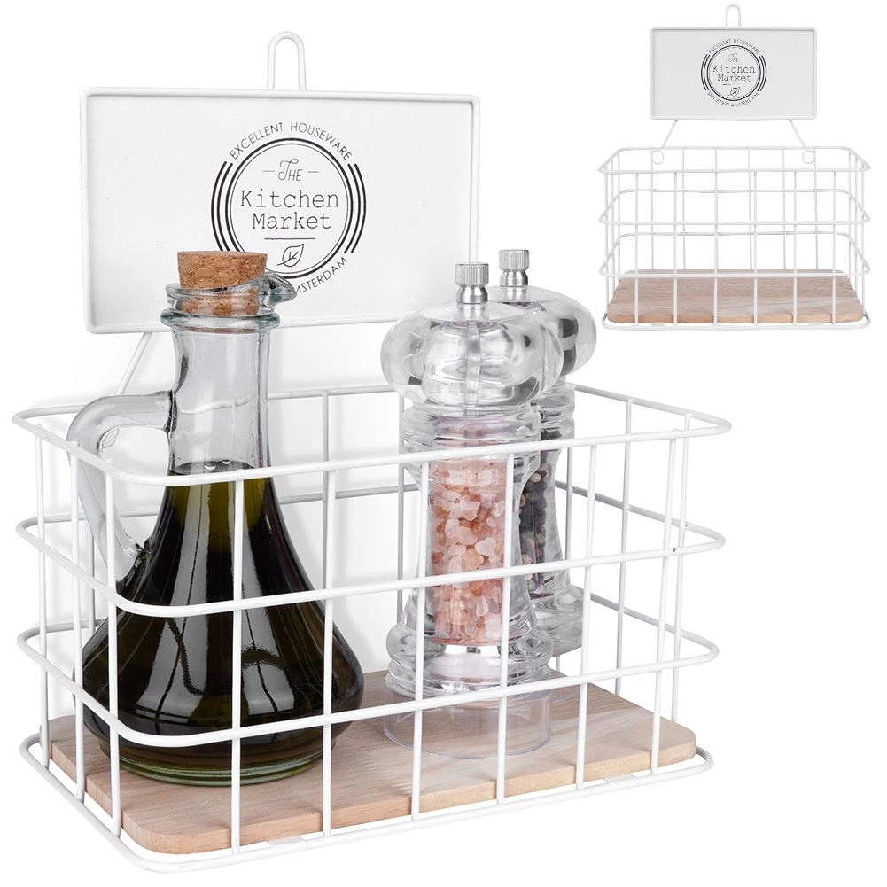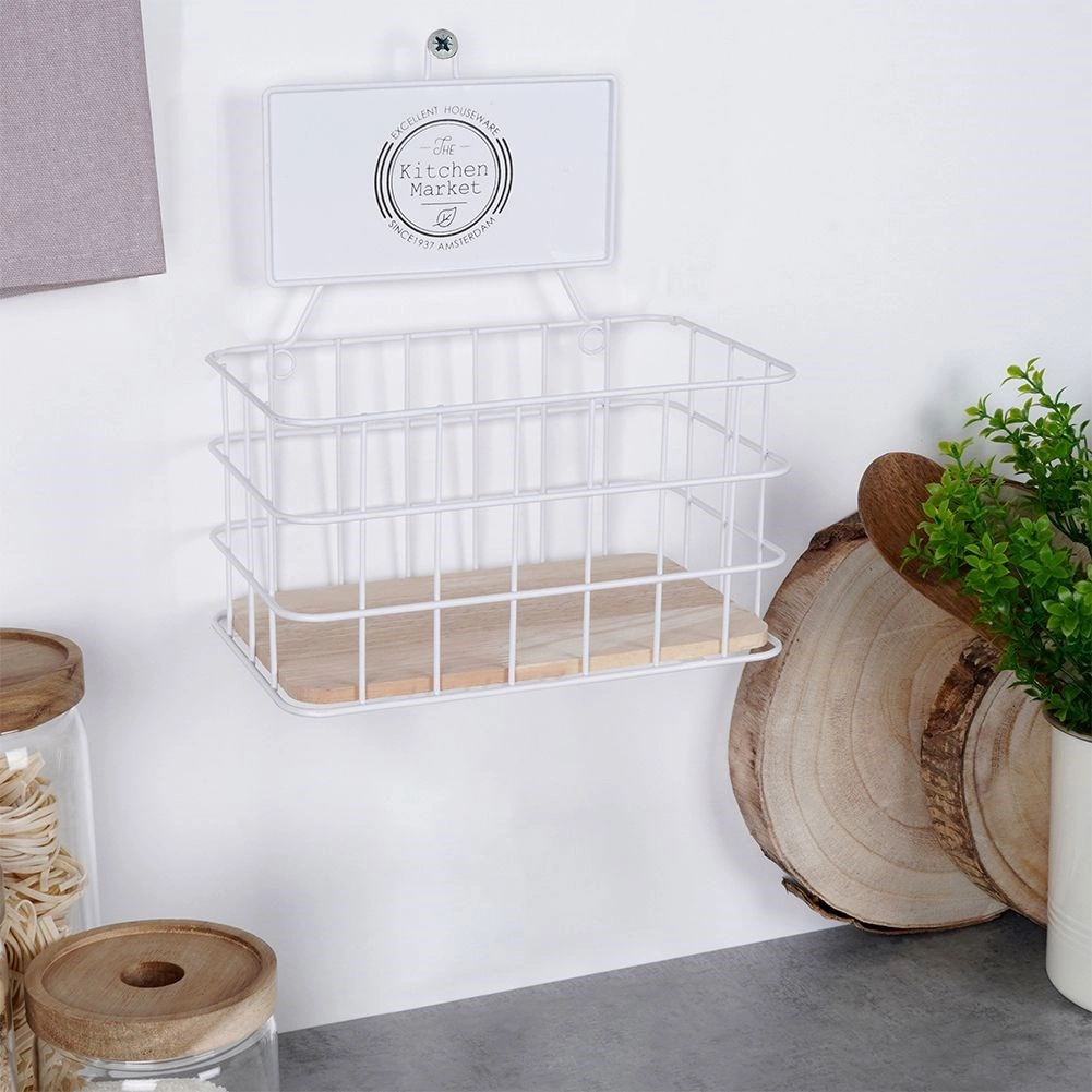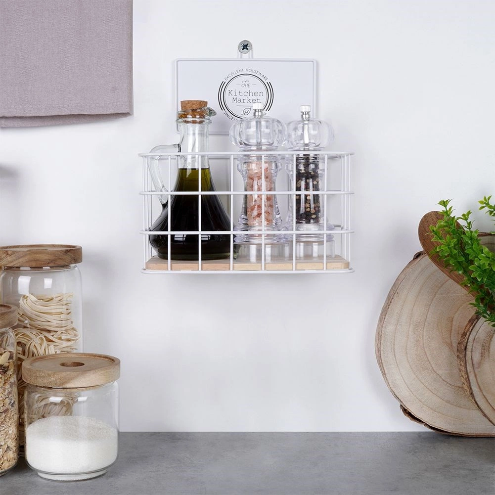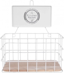 Ta ponadczasowa półka kuchenna w połączeniu białego metalu i dębowego drewna świetnie wpasuje się zarówno w nowoczesne, jak i klasyczne wnętrza. Otwarty druciany design zapewnia przejrzystość i szybki dostęp do przechowywanych przedmiotów, a dekoracyjny napis „The Kitchen Market” dodaje uroku.